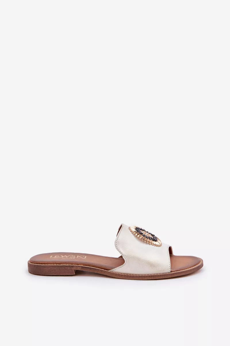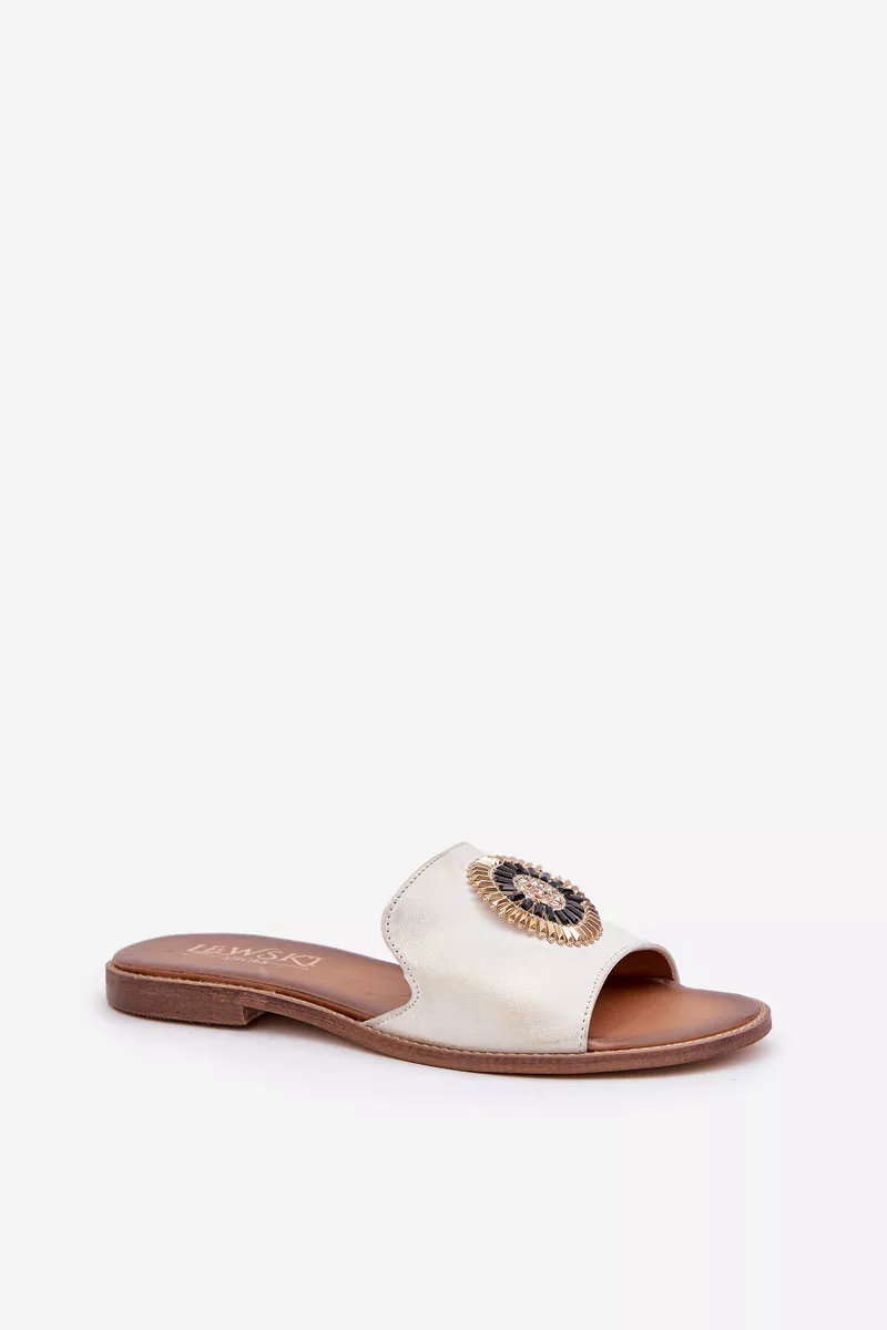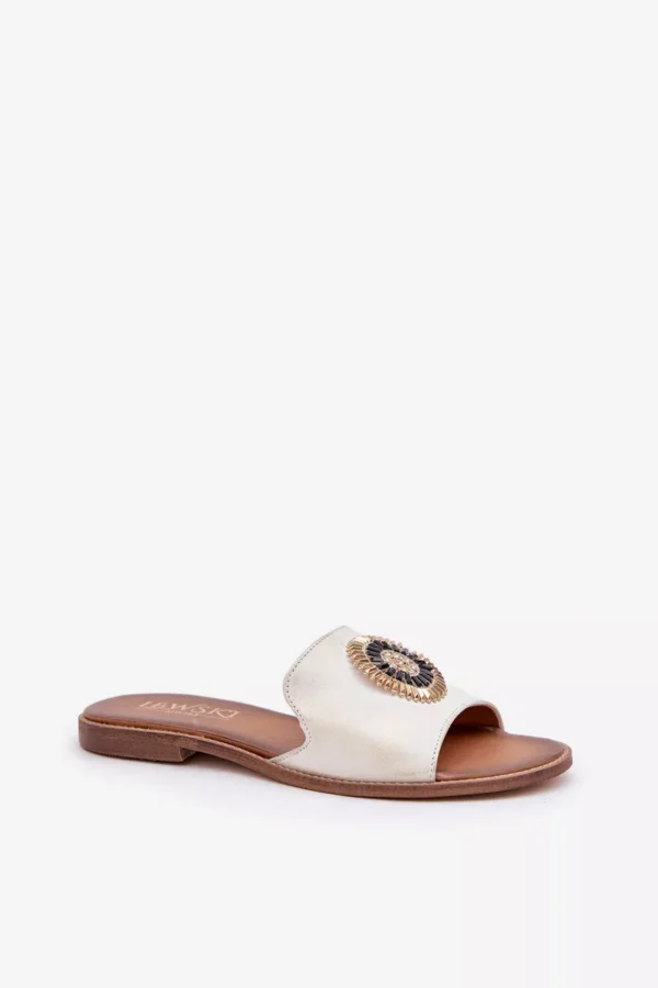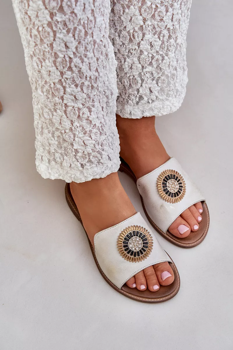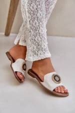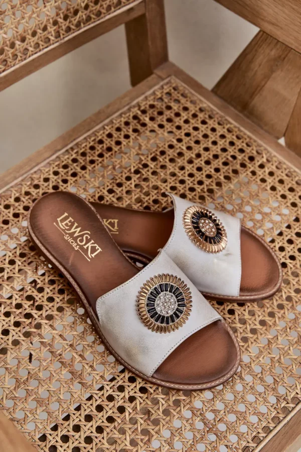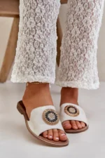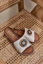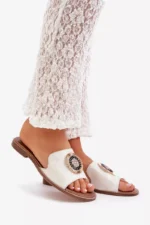 Šie sieviešu čības, kas izgatavotas no augstas kvalitātes dabīgās ādas, apvieno eleganci un komfortu. Tās ir ar plakanu papēdi, kas nodrošina komfortu visas dienas garumā. Smalkais rotājums uz augšdaļas piešķir tām unikālu šarmu un eleganci, padarot tās ideālas gan ikdienas, gan elegantiem stiliem. Ideālas siltām dienām, tās ir neaizstājams aksesuārs vasaras kleitām, biksēm vai svārkiem. Izvēloties izmēru, lūdzu, izmantojiet izmēru tabulu.