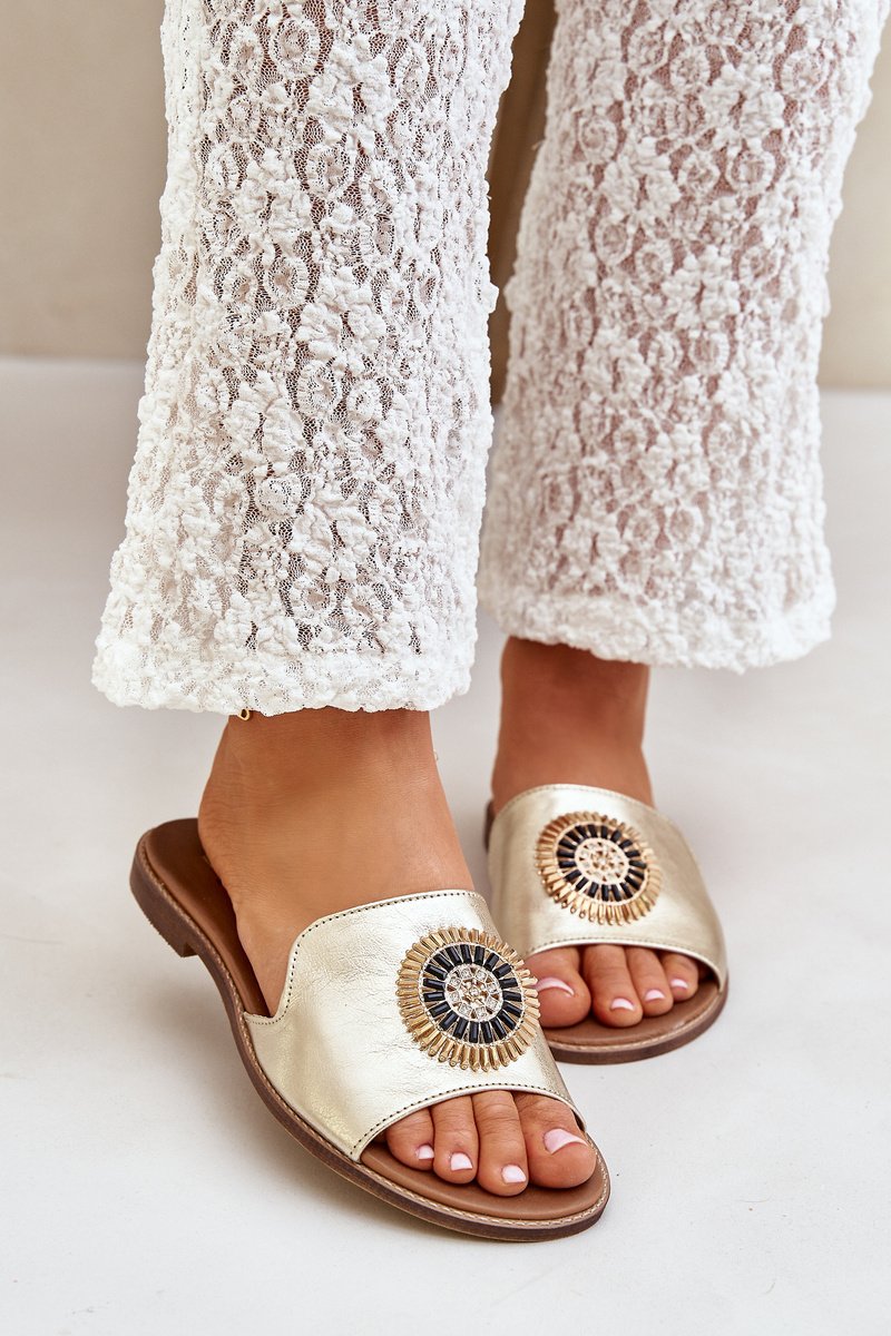 Šie sieviešu čības, kas izgatavotas no augstas kvalitātes dabīgās ādas, apvieno eleganci un komfortu. Tās ir ar plakanu papēdi, kas nodrošina komfortu visas dienas garumā. Smalkais rotājums uz augšdaļas piešķir tām unikālu šarmu un eleganci, padarot tās ideālas gan ikdienas, gan elegantiem stiliem. Ideālas siltām dienām, tās ir neaizstājams aksesuārs vasaras kleitām, biksēm vai svārkiem. Izvēloties izmēru, lūdzu, izmantojiet izmēru tabulu.