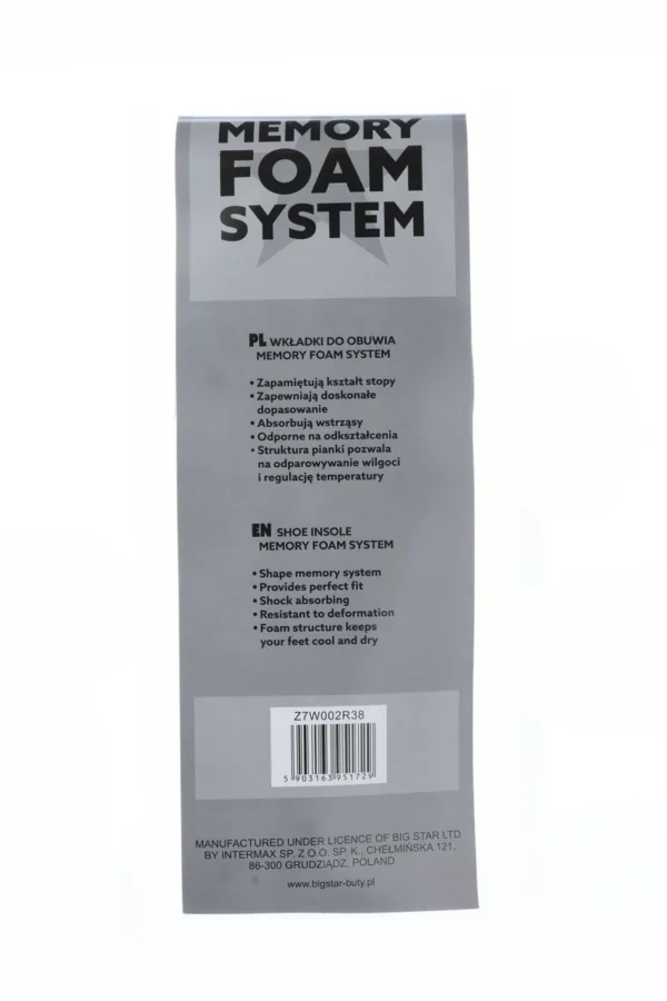 MEMORY FOAM SYSTEM BIG STAR zolītes nodrošina perfektu pielāgošanos, atceras jūsu pēdas formu un absorbē triecienus. Zolītes deformācijai izturīgā struktūra ļauj mitrumam iztvaikot un regulē temperatūru.