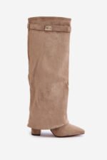 Eleganti sieviešu zābaki, izgatavoti no videi draudzīga zamšāda. Bloka papēdis. Smaili purngali. Šī modeļa izcilā iezīme ir apvītā augšstilba daļa ar noņemamu siksnu augšstilba augšdaļā, kas sedz papēdi. Rāvējslēdzējs. Ideāli piemēroti valkāšanai ar kleitām vai svārkiem! Izvēloties izmēru, lūdzu, izmantojiet izmēru tabulu.