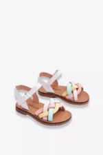 Skaistas bērnu sandales, izgatavotas no videi draudzīgas ādas. Priekšpusē tām ir krustveida siksnas. Atvērtā purngala un papēža daļa ļauj apaviem labi elpot. Velcro aizdare potītes daļā. Plakans papēdis ar neslīdošu gumijas zoli. Lūdzu, izvēloties izmēru, skatieties izmēru tabulu.