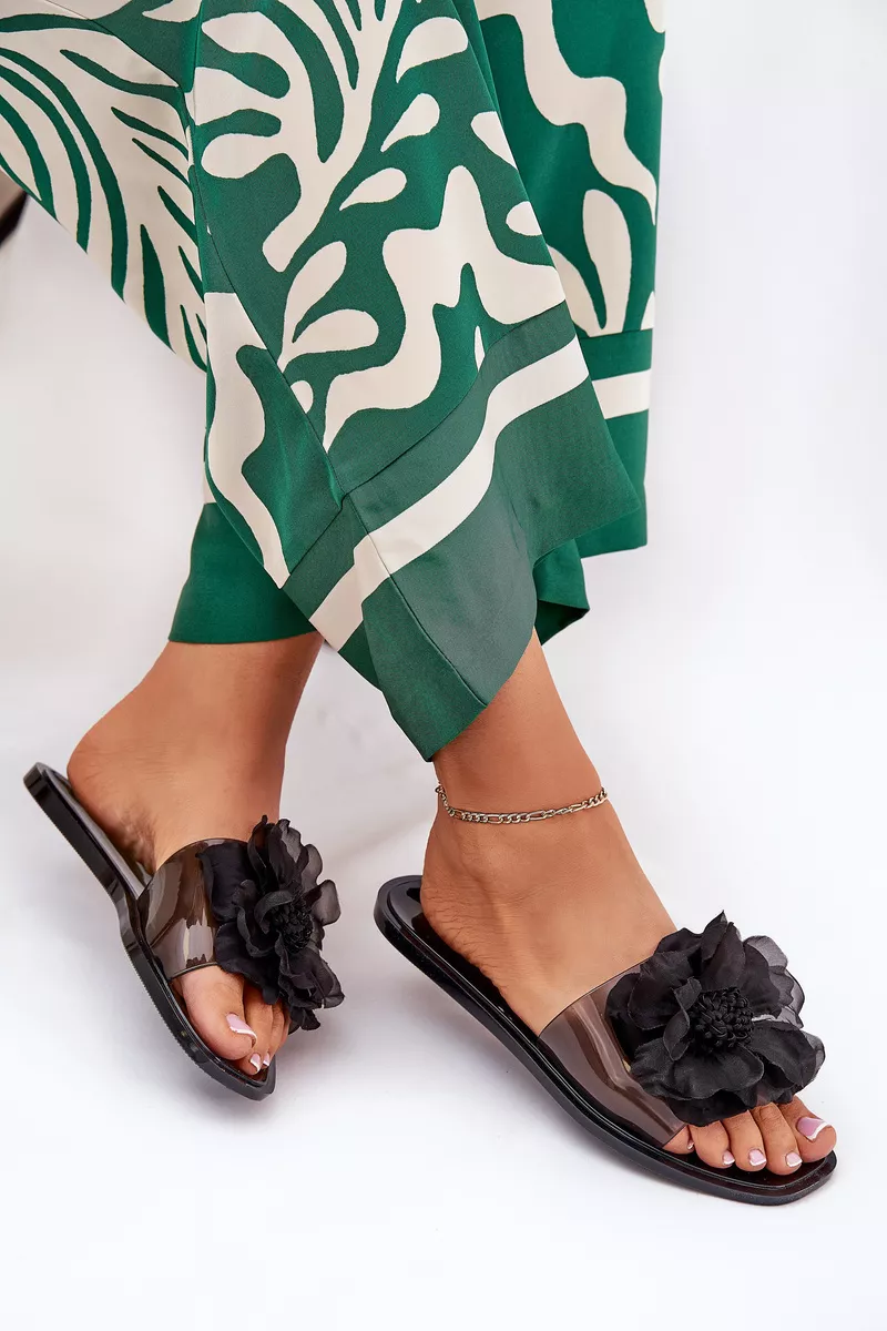 Stilīgas sieviešu čības ar caurspīdīgu virsu, kas izceļas ar vieglumu un modernu izskatu. Plakanā zole nodrošina komfortu ikdienas valkāšanai. Čību priekšpuse ir rotāta ar burvīgu mākslīgo ziedu, kas piešķir tām smalku sievišķību un svaigumu. Ideāli piemērotas vasaras dienām, tās labi sader ar vieglām kleitām, svārkiem vai šortiem, piešķirot eleganci un svaigumu jebkuram izskatam. Izvēloties izmēru, lūdzu, izmantojiet izmēru tabulu.