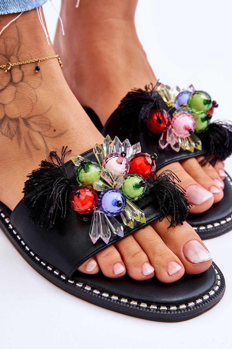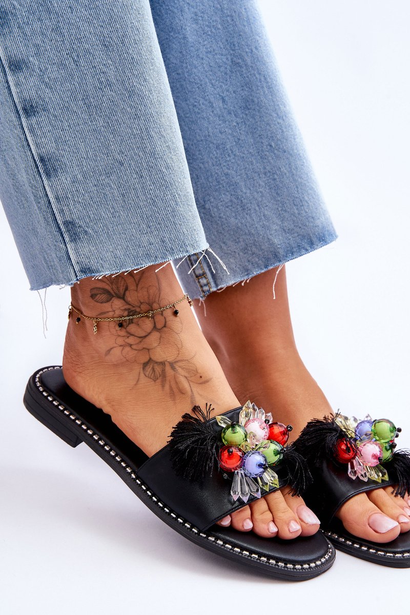 Sieviešu čības no videi draudzīgas ādas. Šim modelim priekšpusē ir rotājumi no pērlītēm un pušķiem. Čības ir ar plakanu papēdi, un to zole ir rotāta ar kniedēm. Čības ir ar ērtu Comfort zoli. Tās noteikti ir jāiegādājas! Izvēloties izmēru, skatieties izmēru tabulu.
