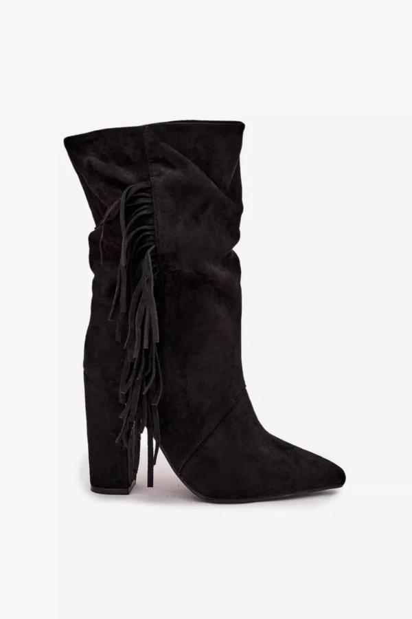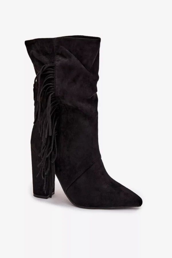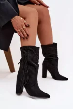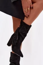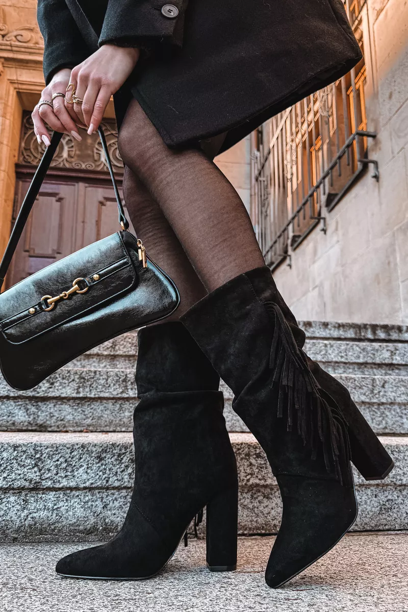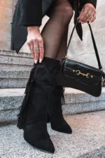 Sieviešu potītes zābaki no mīksta, videi draudzīga zamšāda. Modelim ir stabils papēdis un šaurs purngals, kas skaisti izceļ kājas un piešķir siluetam vieglumu. Savāktā augšdaļa un dekoratīvie kniediņi piešķir visam unikālu, stilīgu raksturu. Zābaki aizdarāmi ar rāvējslēdzēju, kas atvieglo to uzvilkšanu. Izolētais oderējums nodrošina siltumu un komfortu aukstās dienās. Ideāla izvēle sievietēm, kuras vēlas apvienot komfortu ar boho eleganci — tie labi sader ar gan bikšēm, gan kleitām.