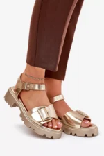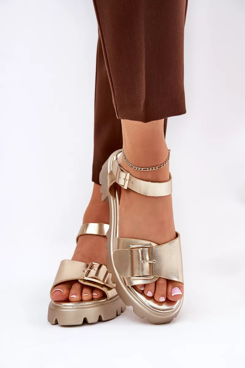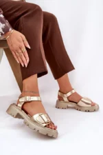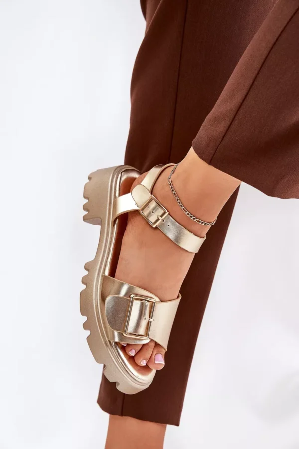 Elegantas sieviešu sandales, izgatavotas no videi draudzīgas ādas, ar platformu un plakanu papēdi, kas nodrošina komfortu un stabilitāti. Apavu priekšpuse ir rotāta ar lielu zelta sprādzi, kas piešķir tām smalku eleganci un raksturu. Tās tiek aizdarītas ar regulējamu siksnu ar sprādzi, kas ļauj tām ideāli pielāgoties kājai. Šie sandales ir lieliska izvēle siltām dienām, piemērotas gan kleitām, gan biksēm, apvienojot stilu un komfortu katrā izskatā. Izvēloties izmēru, lūdzu, skatieties izmēru tabulu.