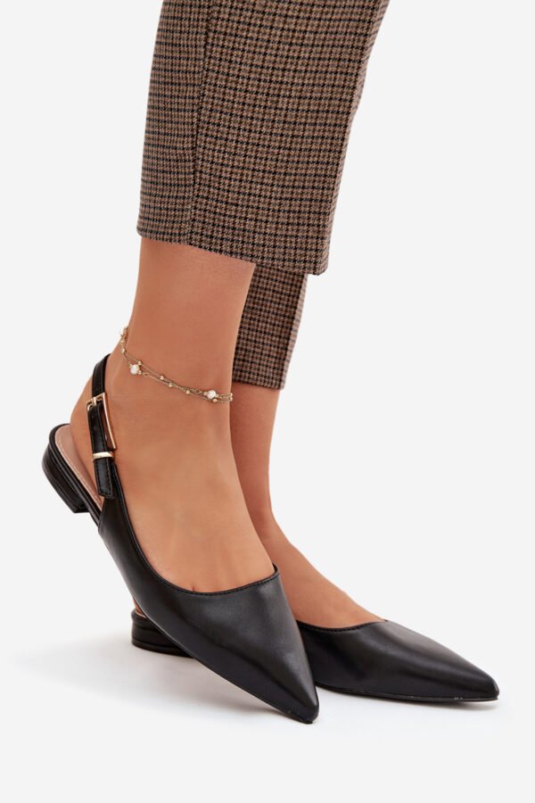 Šīs elegantas sieviešu balerīnu kurpes, kas izgatavotas no videi draudzīgas ādas, ir stilīga izvēle jebkurai dzīves situācijai. Smaile formas purngals skaisti izceļ pēdas līniju. Regulējama siksna ar zelta sprādzi ļauj kurpes ideāli pielāgot pēdai un vienlaikus rada iespaidīgu detaļu. Zems papēdis nodrošina komfortu visas dienas garumā, padarot šīs balerīnu kurpes ideālas ikdienas valkāšanai, darbam vai sanāksmēm. Izvēloties savu izmēru, lūdzu, skatieties izmēru tabulu.