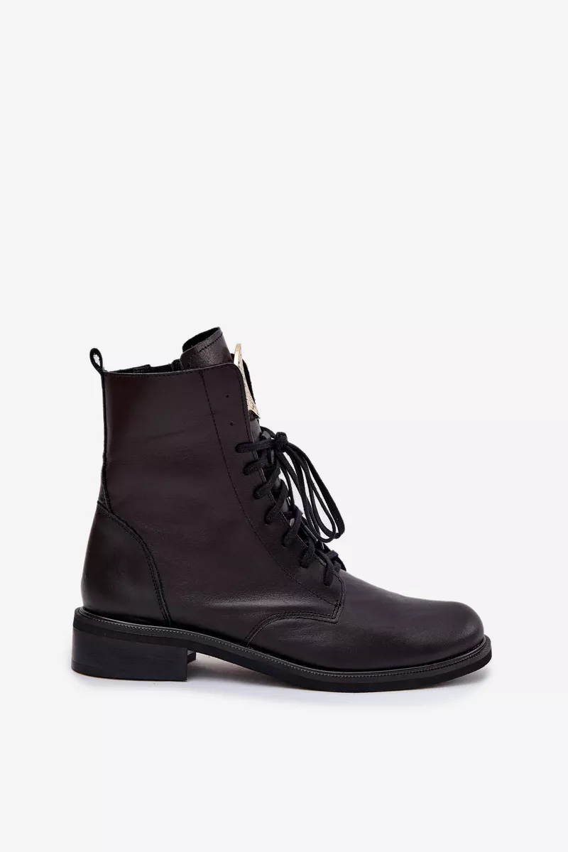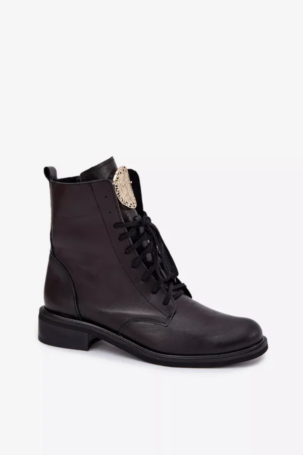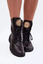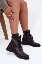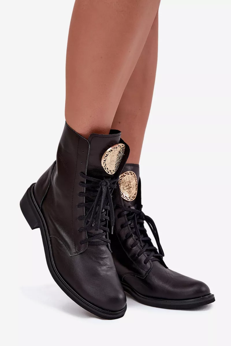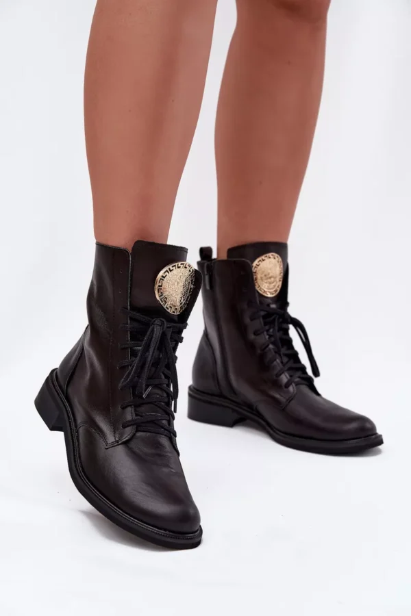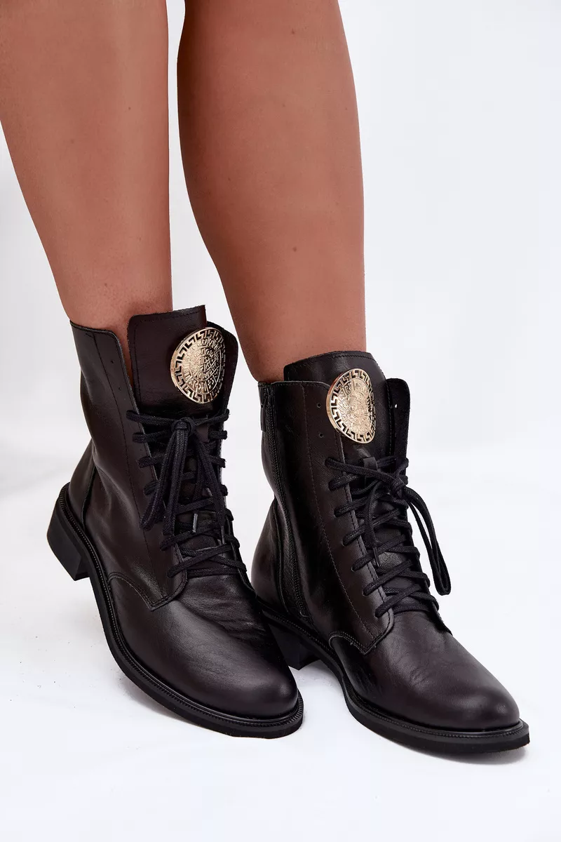Sieviešu ādas potītes zābaki, kas apvieno klasisko un mūsdienīgo stilu. Tie ir ērti un stabili visas dienas garumā, un tiem ir plakans papēdis. Aizsietie auklas nodrošina labu piegulumu, bet papildu rāvējslēdzējs atvieglo to uzvilkšanu. Mēle ir rotāta ar zelta detaļu, kas piešķir eleganci. Šie zābaki labi sader ar dažādiem stiliem, apvienojot komfortu un modernu akcentu. Izvēloties izmēru, lūdzu, izmantojiet izmēru tabulu. Izvēloties izmēru, lūdzu, izmantojiet izmēru tabulu.