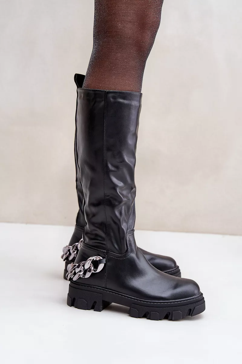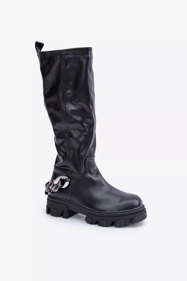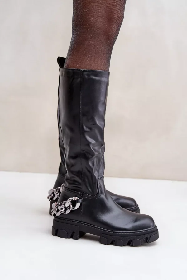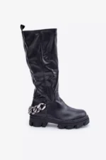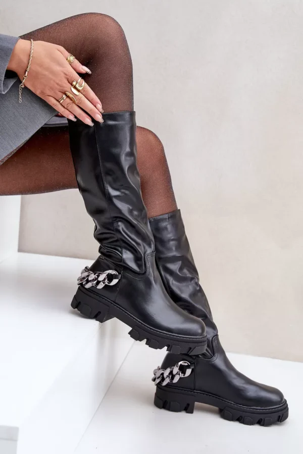 Šie sieviešu zābaki, kas izgatavoti no videi draudzīgas ādas, ir ideāls komforta un stila apvienojums. Gluds papēdis nodrošina komfortu visas dienas garumā. Noapaļoti purngali. Augšstilba augstie zābaki ir dekorēti ar modernu ķēdi. Stilīgi un universāli, tie ir ideāli piemēroti gan ikdienas, gan formālākai stilistikai. Izvēloties izmēru, skatieties izmēru tabulu.