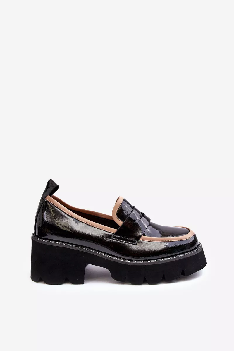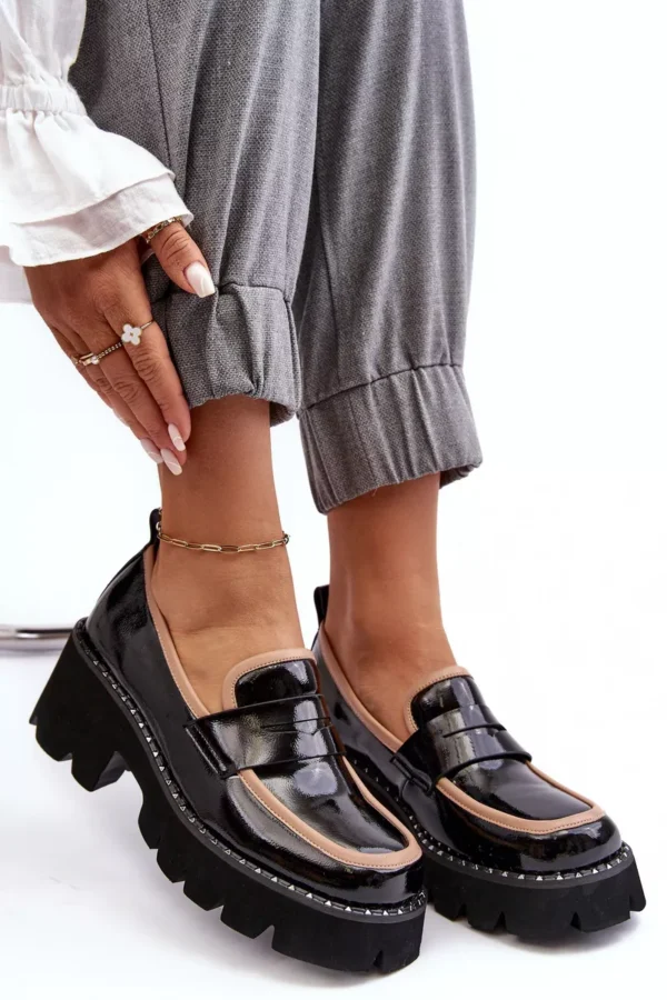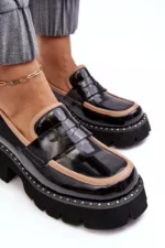 Šie sieviešu mokasīni ir izgatavoti no videi draudzīgas ādas. Tie ir aprīkoti ar dekoratīvu siksnu ar izgriezumu priekšā. Šis modelis ir veidots uz plakanas papēža un platformas, kas papildus ir dekorēta ar kalnu kristāliem. Mokasīniem ir dabīgās ādas zole. Šis modelis ir ideāli piemērots pavasara-rudens sezonai! Izvēloties izmēru, lūdzu, izmantojiet izmēru tabulu.