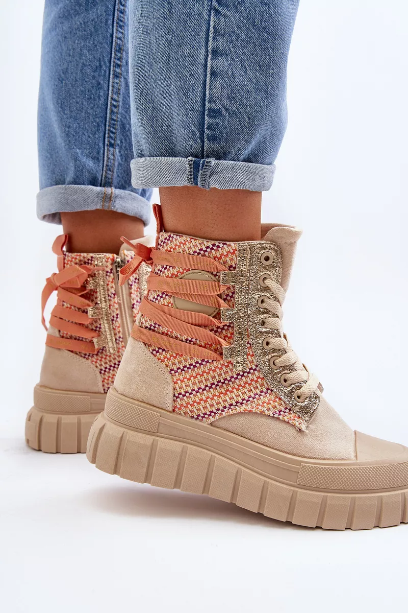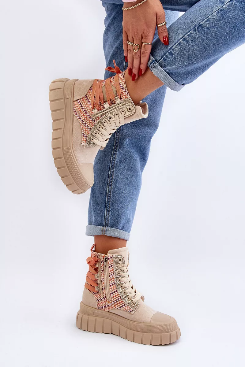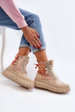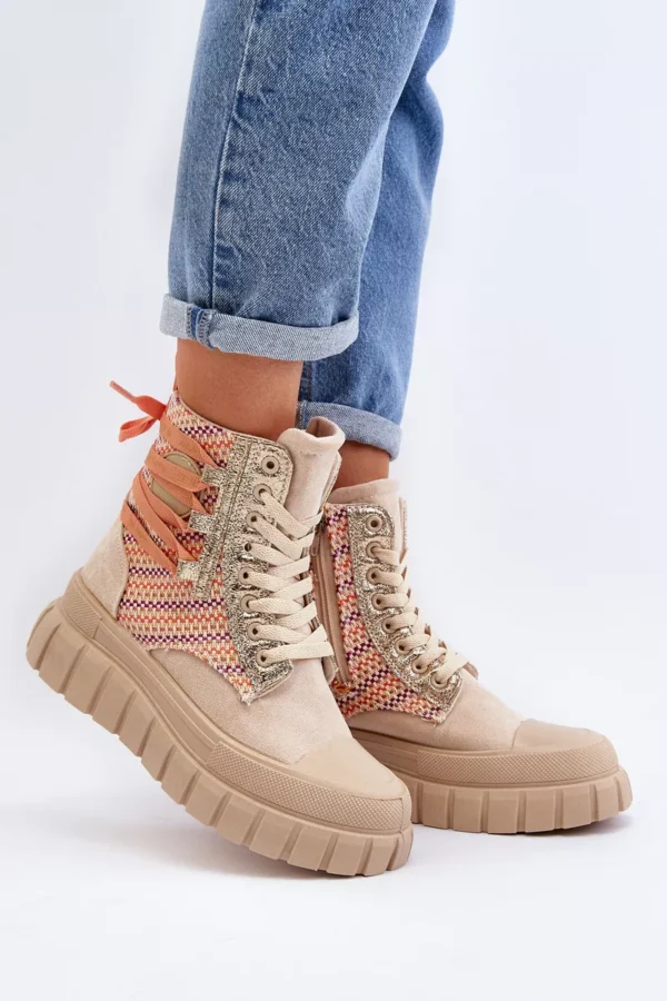 Augstas kvalitātes sieviešu sporta apavi, kas izgatavoti no videi draudzīga zamšāda un tekstilmateriāla kombinācijas. To masīvā platforma un dubultās auklas piešķir modernu izskatu, kas labi sader ar dažādiem stiliem. Papildu rāvējslēdzējs atvieglo to uzvilkšanu. Absolūti nepieciešams jūsu garderobē! Lūdzu, izvēloties izmēru, skatieties izmēru tabulu.