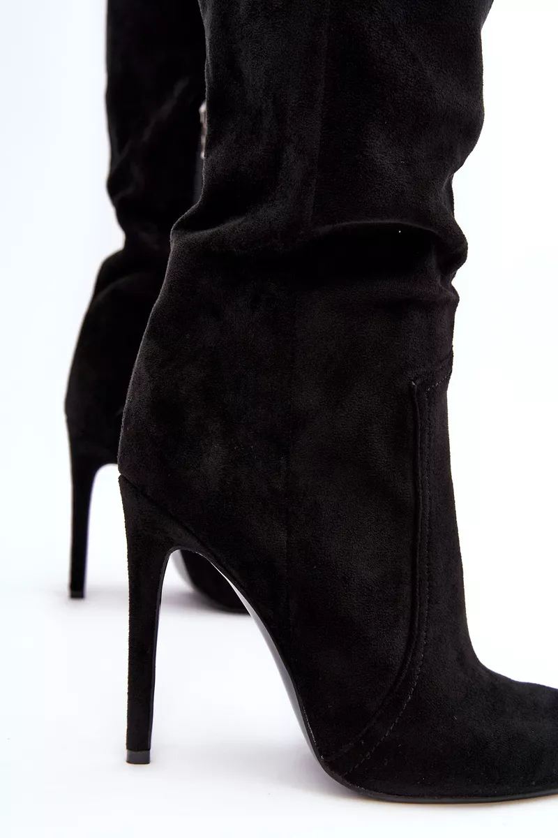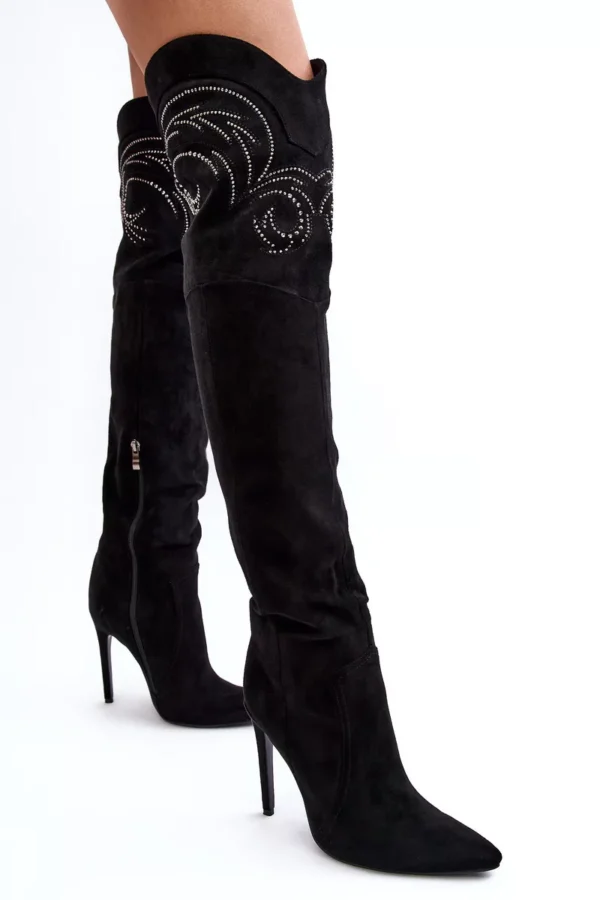 Sieviešu zābaki ar augstu augšdaļu virs ceļgala. Uz stiletto papēža. Izgatavoti no videi draudzīga zamšāda. Aizdarāmi ar papildu rāvējslēdzēju. Smaili purngali padara kājas vizuāli slaidākas. Iekšpuse ir mīksti polsterēta ar patīkamu uz tausti uz apavu oderi. Pirksts ir stingrs. Potītes augšdaļa ir dekorēta ar izšuvumiem un kalnu kristāliem. Šis modelis ir obligāts jūsu garderobē! Izvēloties izmēru, skatieties izmēru tabulu.