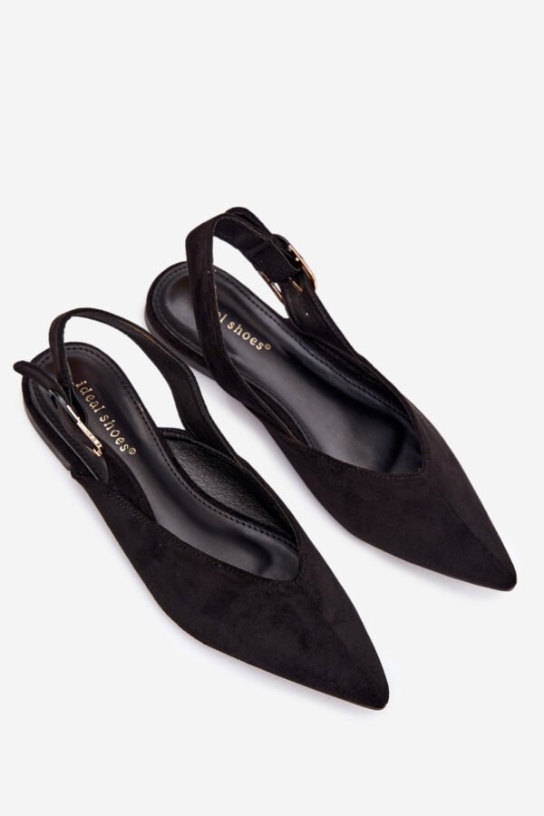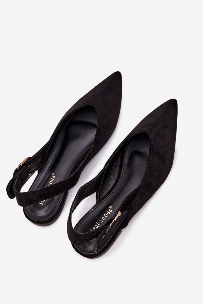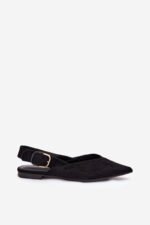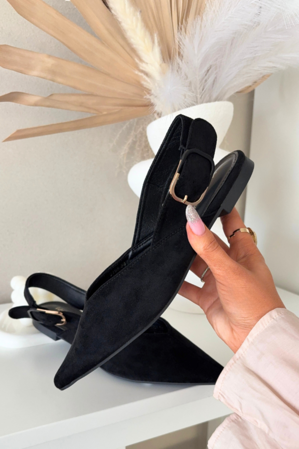 Šīs sieviešu balerīnu kurpes, kas izgatavotas no videi draudzīga zamšāda, ir stilīga un ērta izvēle ikdienas valkāšanai. Plakanais papēdis nodrošina komfortu, bet smaile purngals piešķir eleganci un vizuāli pagarinātu pēdu. Aizmugurē ir regulējama siksna ar lielu dekoratīvu sprādzi, kas piesaista uzmanību un ir modes akcents. Šīs balerīnu kurpes ir ideālas sievišķīgam, modernam izskatam. Izvēloties izmēru, skatieties izmēru tabulu.