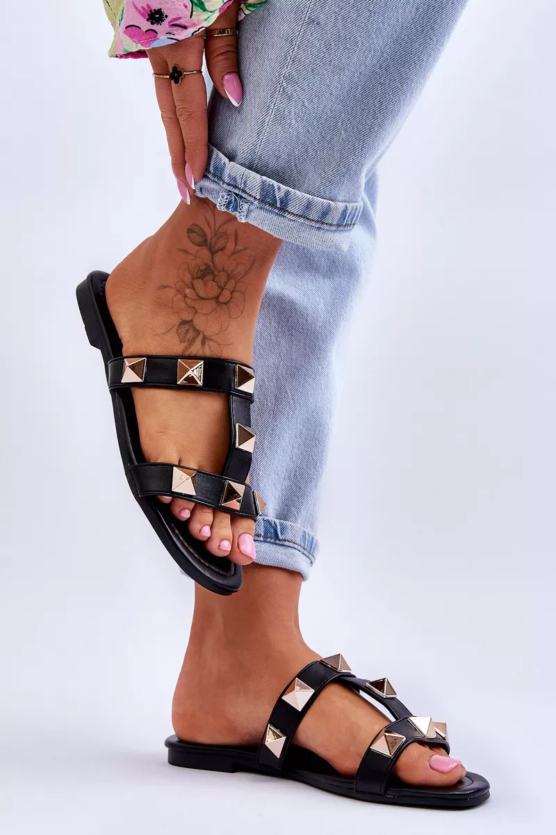 Šie klasiskie sieviešu čības ir izgatavotas no videi draudzīgas ādas. Tām ir moderni izgriezumi sānos. Tās ir arī dekorētas ar lieliem kniedēm. Čībām ir plakans papēdis ar gumijas, neslīdošu zoli. Šis modelis noteikti patiks katrai sievietei karstās dienās. Mīkstā, videi draudzīgā ādas zole ļauj ērti valkāt čības pat visu dienu. Izvēloties izmēru, skatieties izmēru tabulu.