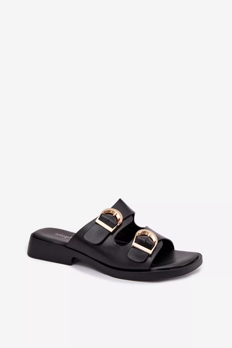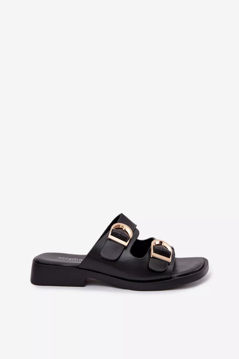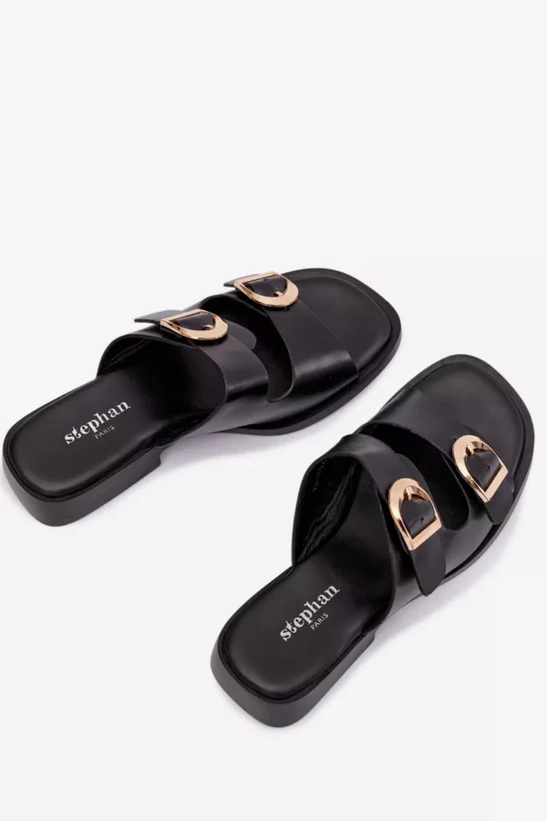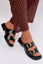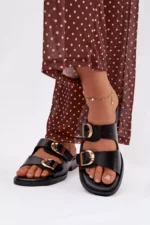 Sieviešu čības no videi draudzīgas ādas – klasiska izvēle ikdienas valkāšanai. Modelim ir divas siksnas ar zelta sprādzēm, kas piešķir eleganci un stilu kopējam izskatam. Plakana papēža nodrošina komfortu un kustību brīvību. Čības ir ideāli piemērotas vasaras stilam un var tikt kombinētas gan ar kleitām, gan ikdienas apģērbiem. Lūdzu, izvēloties izmēru, skatieties izmēru tabulu.