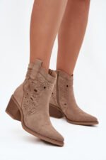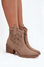 Šie sieviešu atklātie kowboju zābaki ir klasiskā rietumu stila un mūsdienu dizaina apvienojums. Izgatavoti no videi draudzīga zamšāda, tie izskatās viegli un stilīgi, bet smalkie atklātie izgriezumi piešķir tiem izteiksmīgu raksturu un smalku eleganci. Mandeļu formas purngals uzsver sievišķīgo siluetu, bet sānu rāvējslēdzējs nodrošina komfortu un ātru uzvilkšanu. Šie kovboju zābaki ir ideāli piemēroti ikdienas pilsētas stilam vai kā oriģināls akcents izteiksmīgākiem izskatiem. Ideāli piemēroti sievietēm, kas vēlas apvienot komfortu ar modernu un izteiksmīgu izskatu. Izvēloties savu izmēru, lūdzu, izmantojiet izmēru tabulu. Izvēloties savu izmēru, lūdzu, izmantojiet izmēru tabulu.