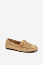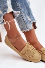 Šie plakanie sieviešu mokasīni, kas izgatavoti no videi draudzīga zamšāda, ir stilīga un ērta izvēle ikdienas valkāšanai. Tiem ir dekoratīvi kniedīši un lenta priekšā. Mīkstais materiāls nodrošina komfortu, bet plakanais zols padara tos ideālus ikdienas valkāšanai. Šie mokasīni ir lielisks papildinājums gan klasiskam, gan brīvākam stilam. Lūdzu, izvēloties izmēru, skatieties izmēru tabulu.
