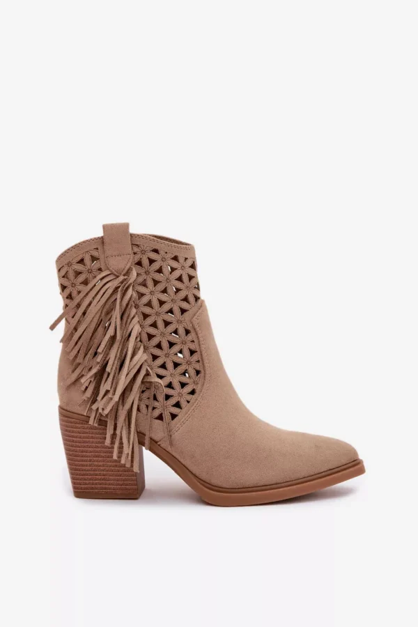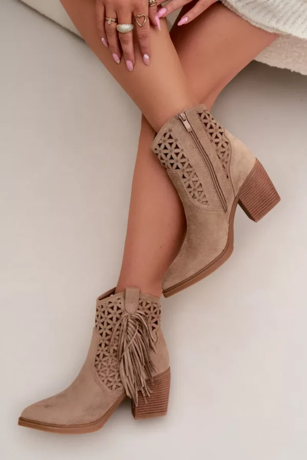 Jezzie zīmola sieviešu kovboju stila kurpes ar papēžiem ir izcila izvēle sievietēm, kuras mīl izteiksmīgus akcentus savā izskatā. Tie ir izgatavoti no videi draudzīga zamšāda, izskatās stilīgi un labi saderas ar modernu rietumu stila izskatu. Smaile, kas rotāta ar kniedēm, piešķir vieglumu un oriģinalitāti. Modelis ar stabilu blokveida papēdi nodrošina komfortu ejot, bet šaurā smaile vizuāli padara kājas slaidākas. Rāvējslēdzējs ļauj tos ātri uzvilkt. Ideāli piemēroti boho stila apģērbiem – gan kleitām, gan džinsiem. Izvēloties izmēru, skatieties izmēru tabulu.