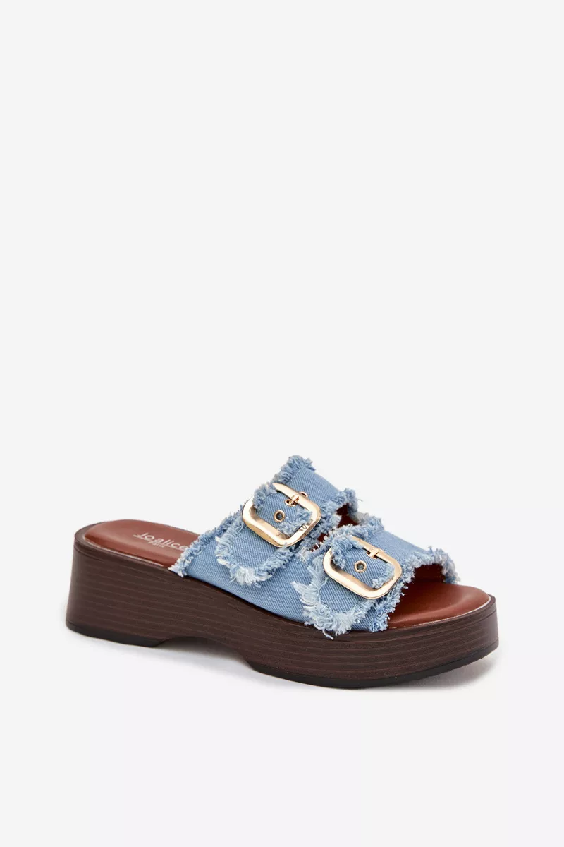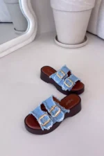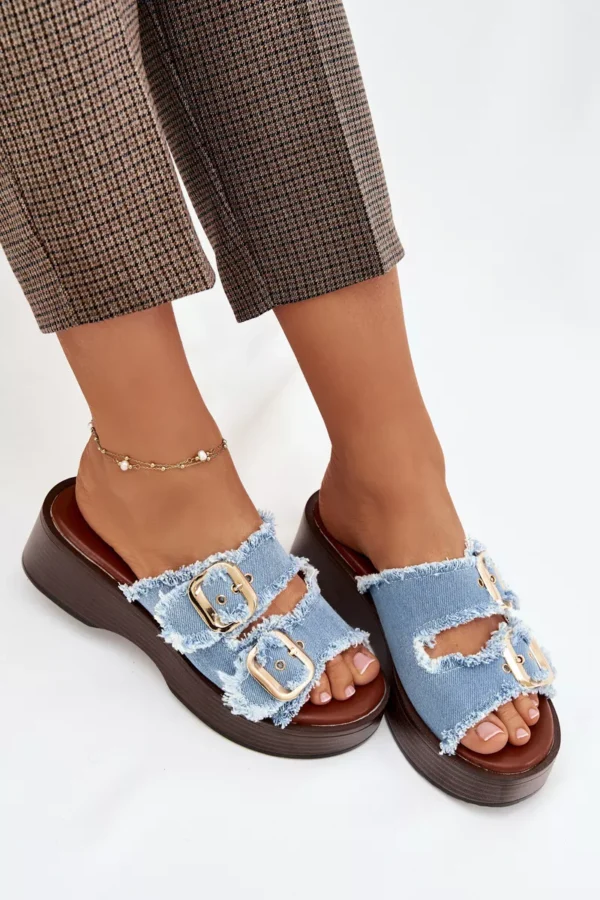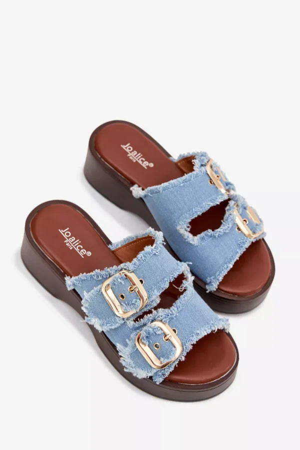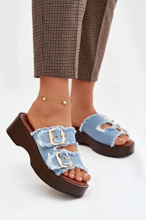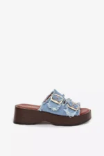 Šie sieviešu čības, kas izgatavotas no tekstilmateriāla, ir stilīga un ērta izvēle ikdienas valkāšanai. Modelim ir divas siksnas ar zelta sprādzēm, kas uzsver tā modernu izskatu. Izgatavoti uz platformas. Mīksta zole palielina komfortu, pat valkājot ilgāku laiku. Čības ir ideāli piemērotas vasaras stilam, apvienojot funkcionalitāti un stilīgu izskatu. Izvēloties izmēru, skatieties izmēru tabulu.