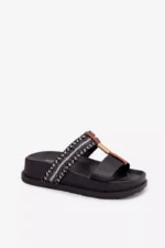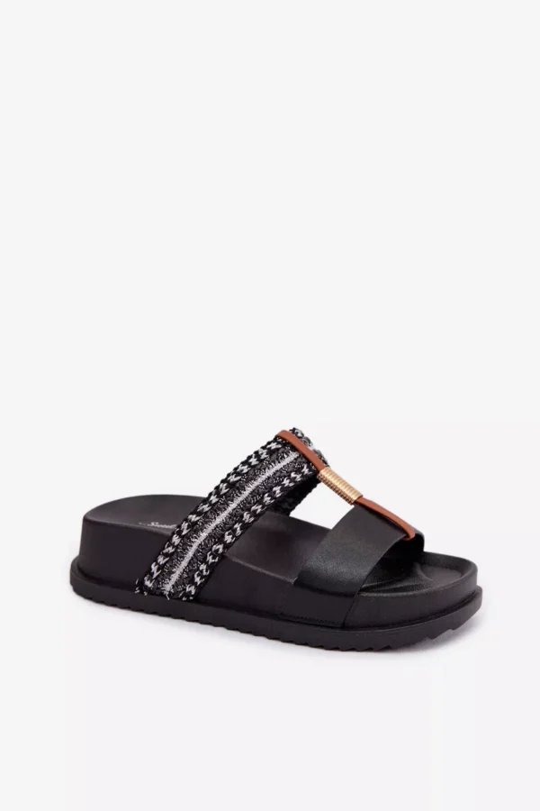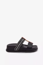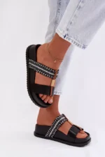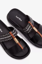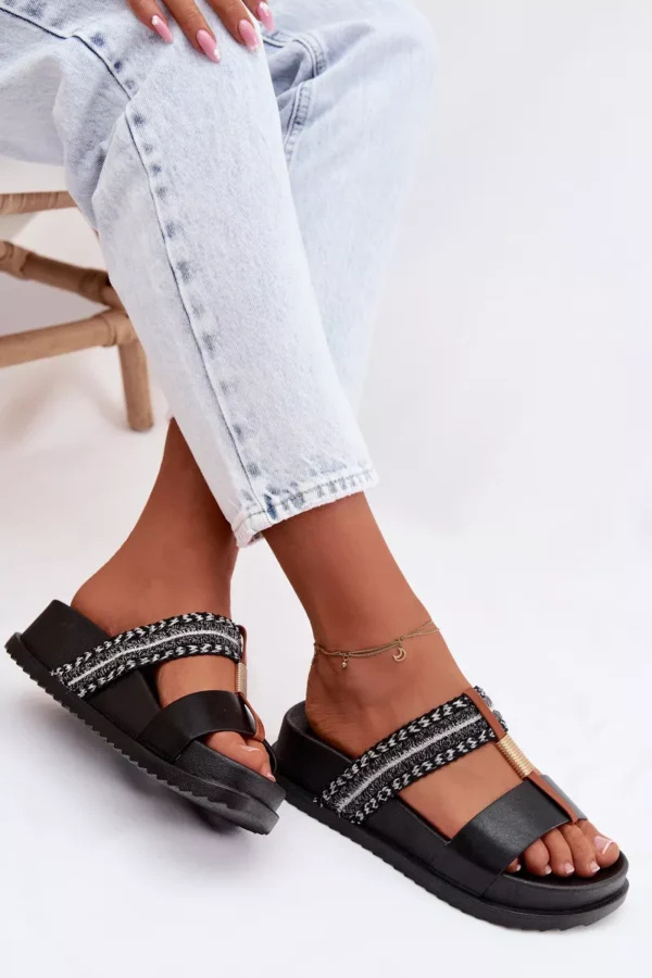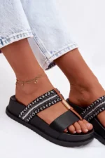 Sieviešu platforma čības ir stilīga izvēle siltajām dienām. Modelis izceļas ar spīdīgu pītu siksnu, kas piesaista uzmanību un piešķir tam modernu raksturu. Zelta detaļas, kas savieno abas siksnas, ir elegants akcents, kas uzsver apavu unikālo izskatu. Platforma nodrošina komfortu un stabilitāti, padarot šos čības ideālus vasaras stilam. Izvēloties izmēru, skatieties izmēru tabulu.