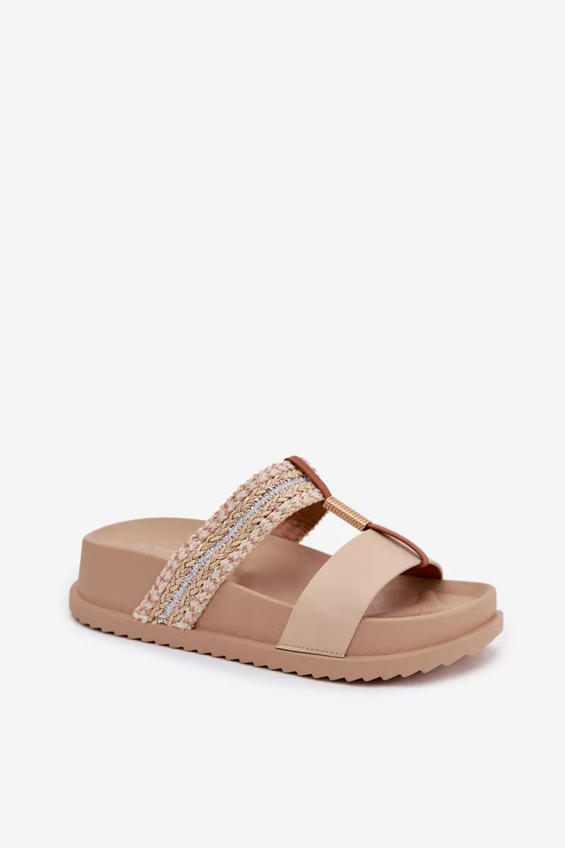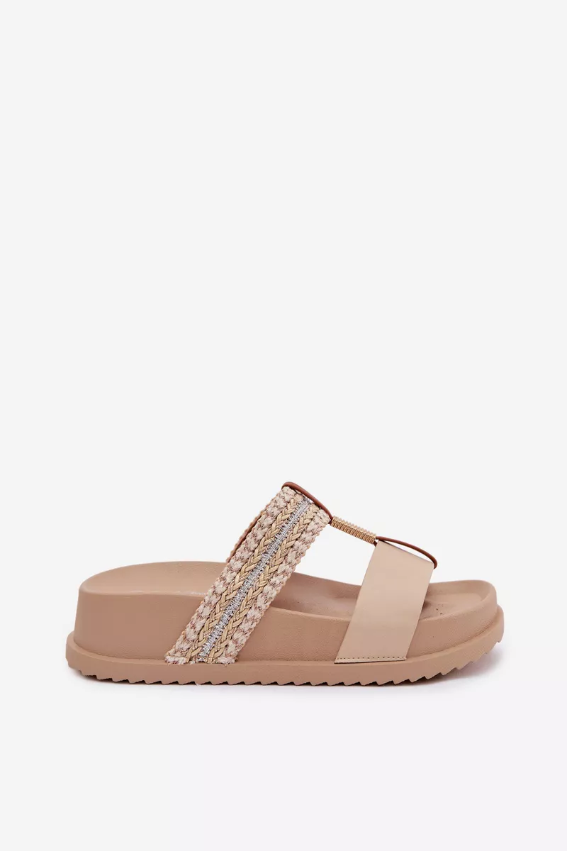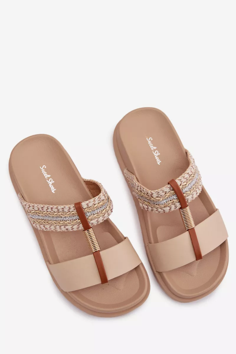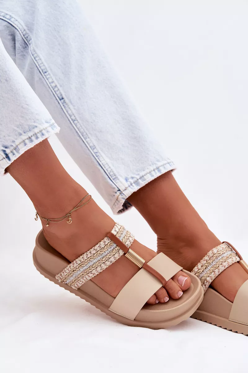 Sieviešu platforma čības ir stilīga izvēle siltajām dienām. Modelis izceļas ar spīdīgu pītu siksnu, kas piesaista uzmanību un piešķir tam modernu raksturu. Zelta detaļas, kas savieno abas siksnas, ir elegants akcents, kas uzsver apavu unikālo izskatu. Platforma nodrošina komfortu un stabilitāti, padarot šos čības ideālus vasaras stilam. Izvēloties izmēru, skatieties izmēru tabulu.