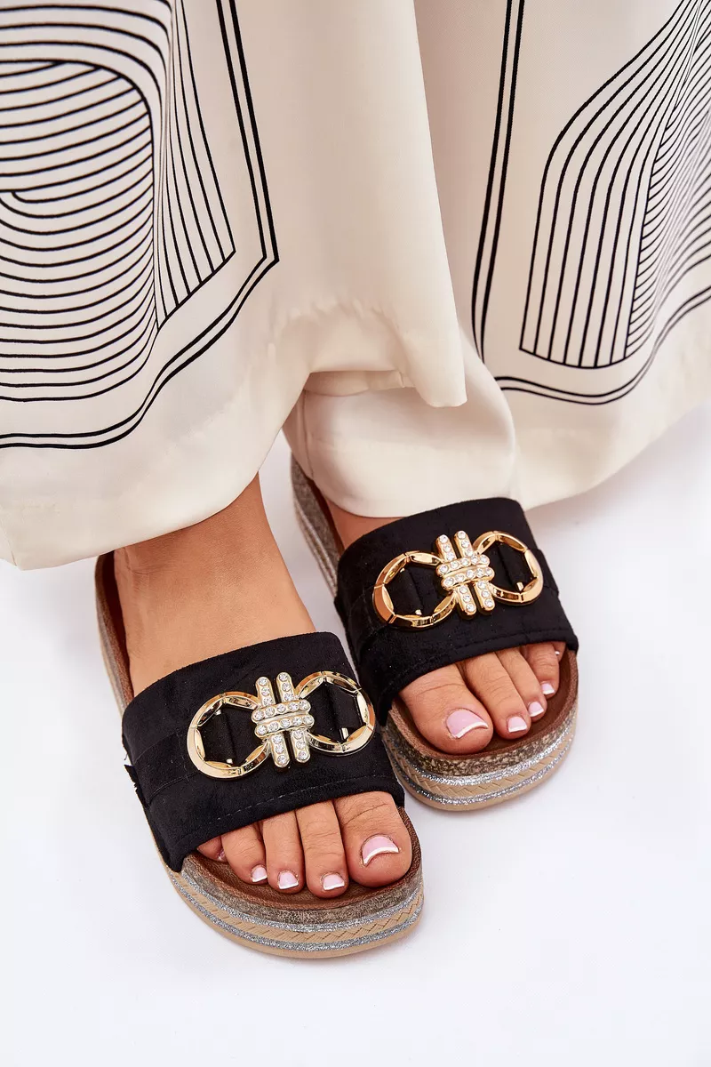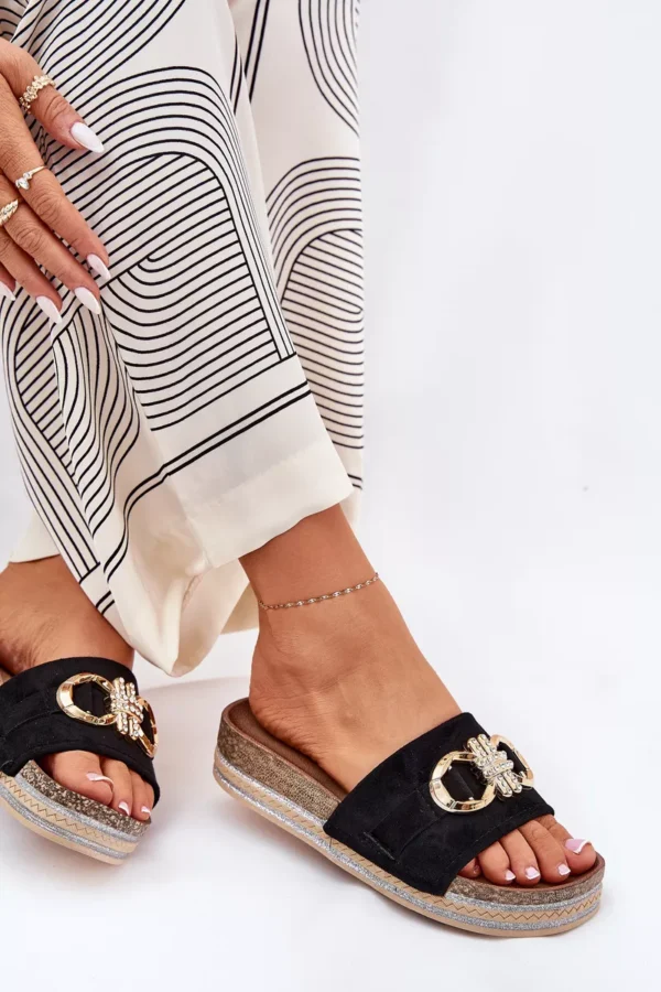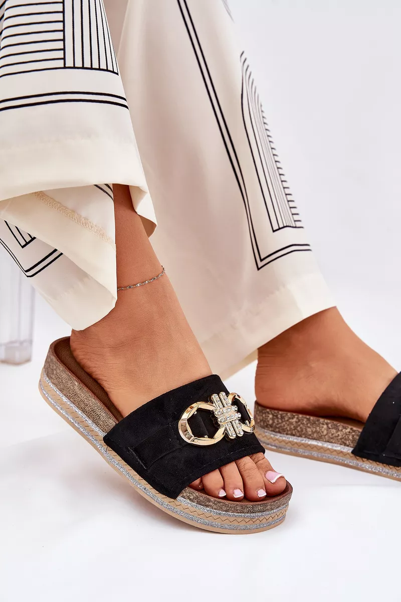 Šīs sandales ir izgatavotas no videi draudzīga zamšāda. Priekšpuse ir dekorēta ar spilgtu zelta elementu, kas piešķir tām unikālu raksturu. Paceltas uz platformas ar spīdīgu virsmu, tās piešķir mirdzumu jebkuram stilam. Šie sandales ir ideāla izvēle vasaras dienām, tie lieliski saderas ar kleitām, svārkiem vai šortiem, piešķirot modernu stilu jebkuram apģērbam. Izvēloties savu izmēru, lūdzu, izmantojiet izmēru tabulu.
