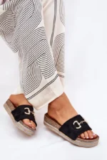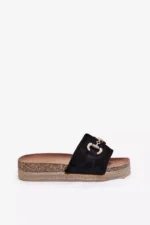 Šie čības ir izgatavotas no videi draudzīga zamšāda. Tām ir dekoratīvs zelta akcents priekšpusē, kas piešķir tām smalku mirdzumu. Tās ir uz platformas, kas dekorēta ar gliteriem, piešķirot glamour pieskārienu jebkuram stilam. Konturēta zole nodrošina komfortu visas dienas garumā. Šie čības ir ideāli piemērotas vasaras dienām un labi saderas ar kleitām, svārkiem vai biksēm, apvienojot modernu izskatu ar funkcionalitāti. Izvēloties izmēru, lūdzu, izmantojiet izmēru tabulu.