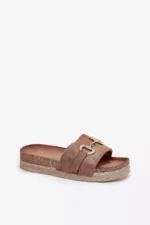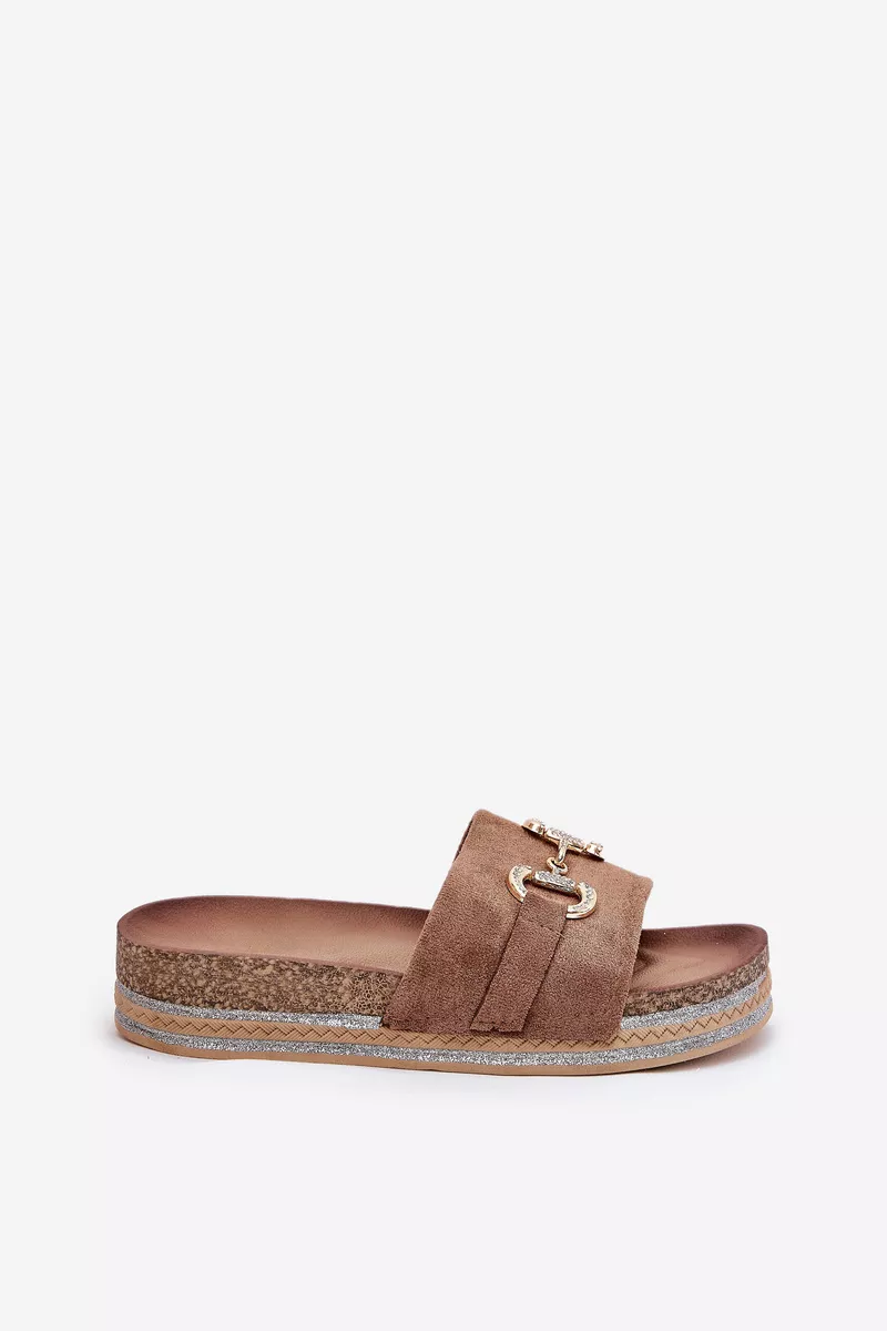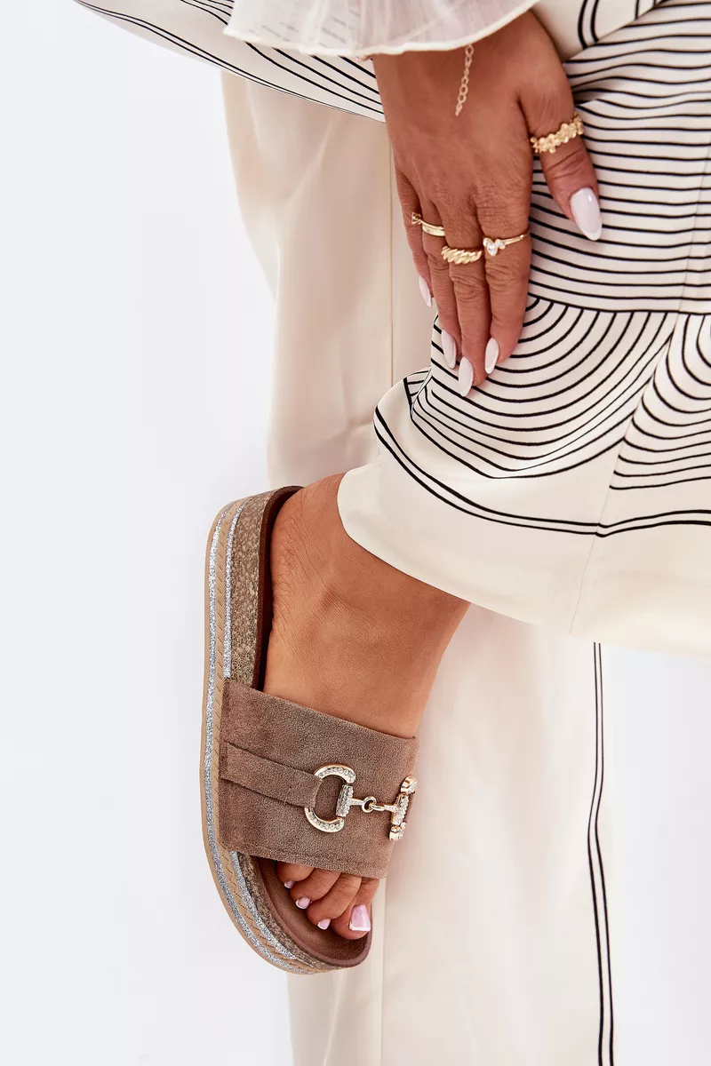 Šie čības ir izgatavotas no videi draudzīga zamšāda. Tām ir dekoratīvs zelta akcents priekšpusē, kas piešķir tām smalku mirdzumu. Tās ir uz platformas, kas dekorēta ar gliteriem, piešķirot glamour pieskārienu jebkuram stilam. Konturēta zole nodrošina komfortu visas dienas garumā. Šie čības ir ideāli piemērotas vasaras dienām un labi saderas ar kleitām, svārkiem vai biksēm, apvienojot modernu izskatu ar funkcionalitāti. Izvēloties izmēru, lūdzu, izmantojiet izmēru tabulu.