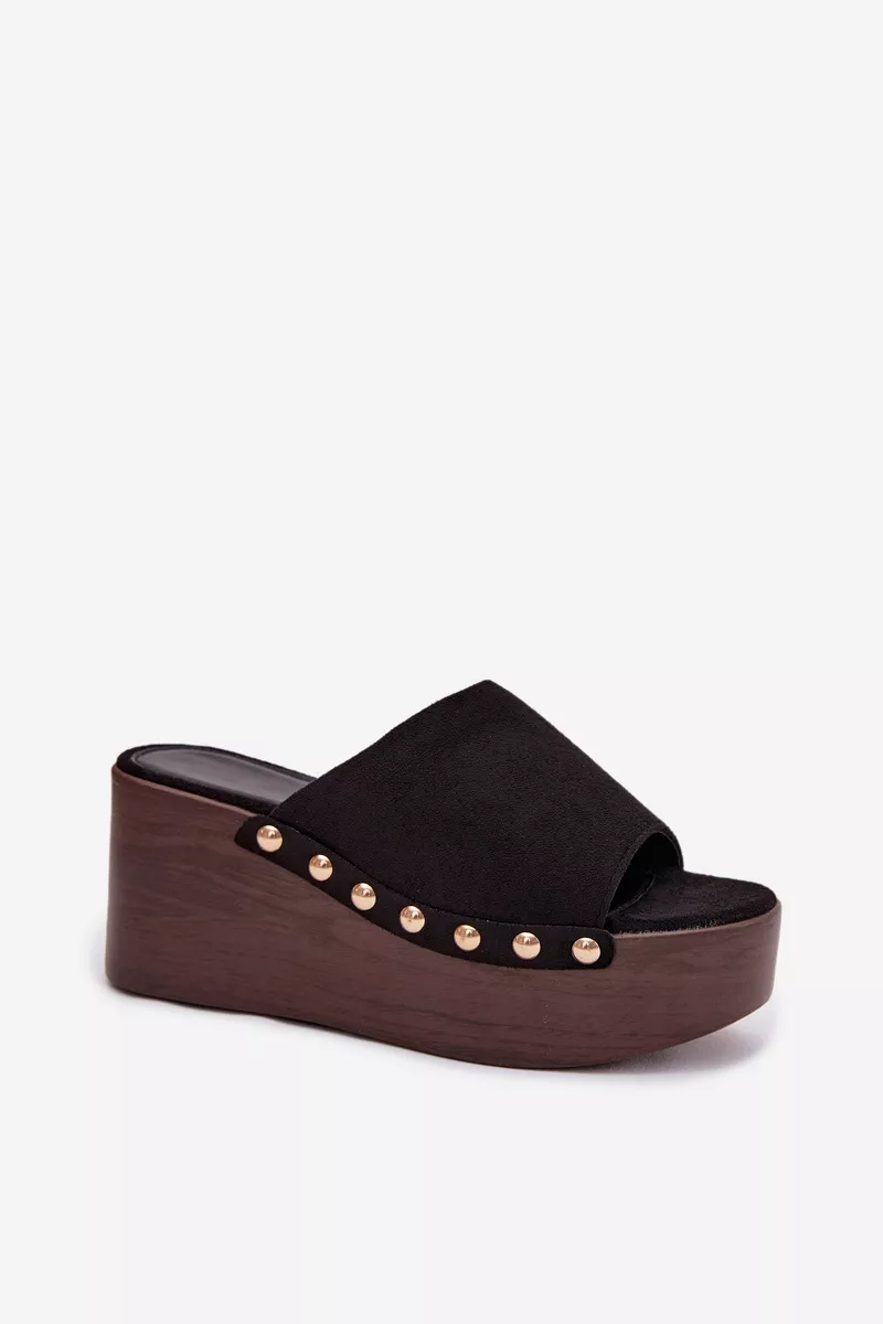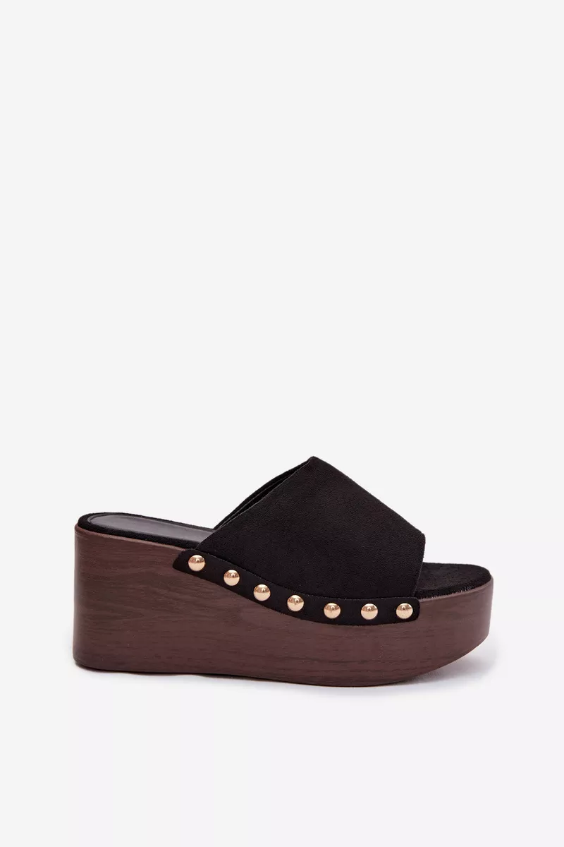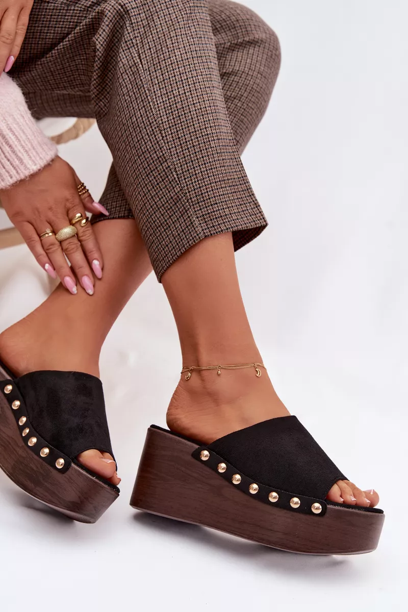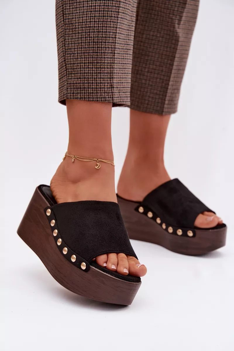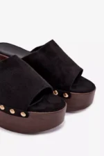 Šie sieviešu čības, kas izgatavotas no videi draudzīga zamšāda, ir stilīga izvēle ikdienai. Papēdis, apvienots ar platformu, nodrošina stabilitāti un komfortu, delikāti uzsverot siluetu. Zelta kniedes sānos piešķir modernu akcentu. Modelis ir ideāli piemērots vasaras stila apģērbiem – kleitām, biksēm vai svārkiem. Ideāla izvēle sievietēm, kas novērtē komfortu un izteiksmīgas, stilīgas detaļas. Izvēloties izmēru, skatieties izmēru tabulu.