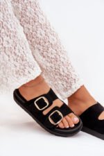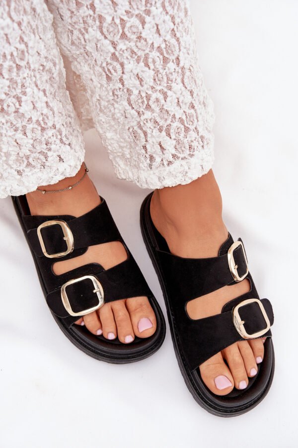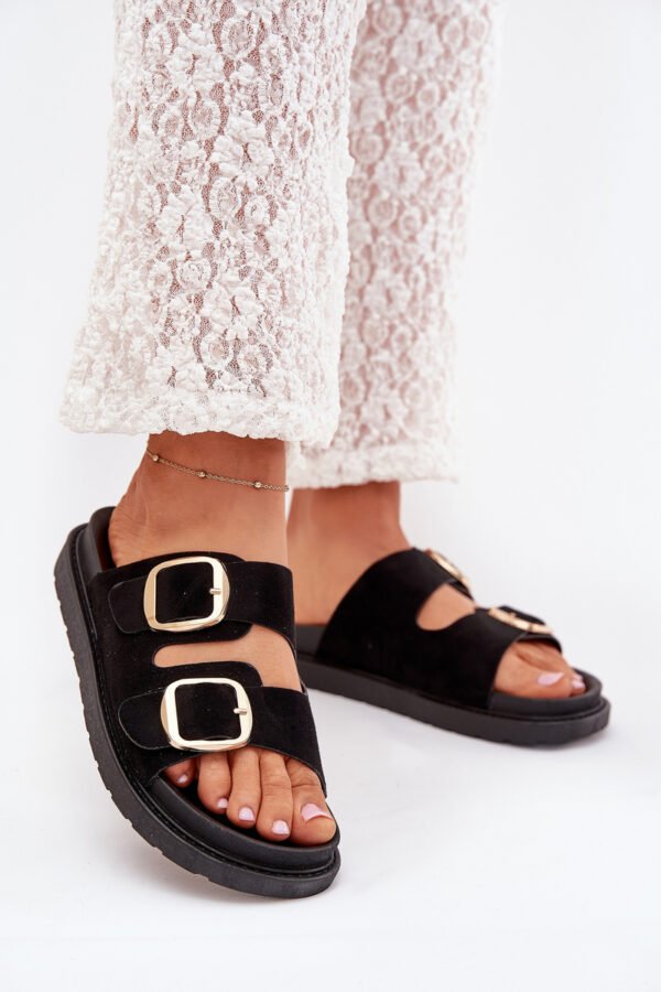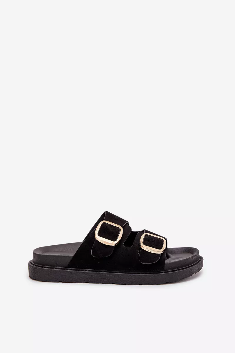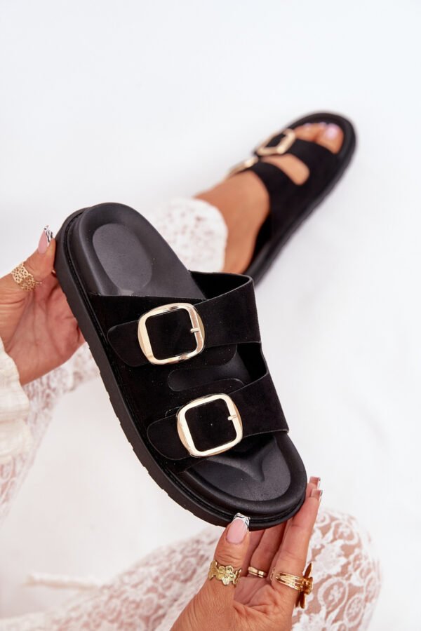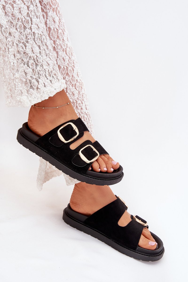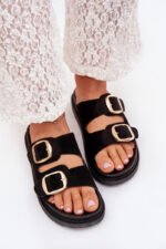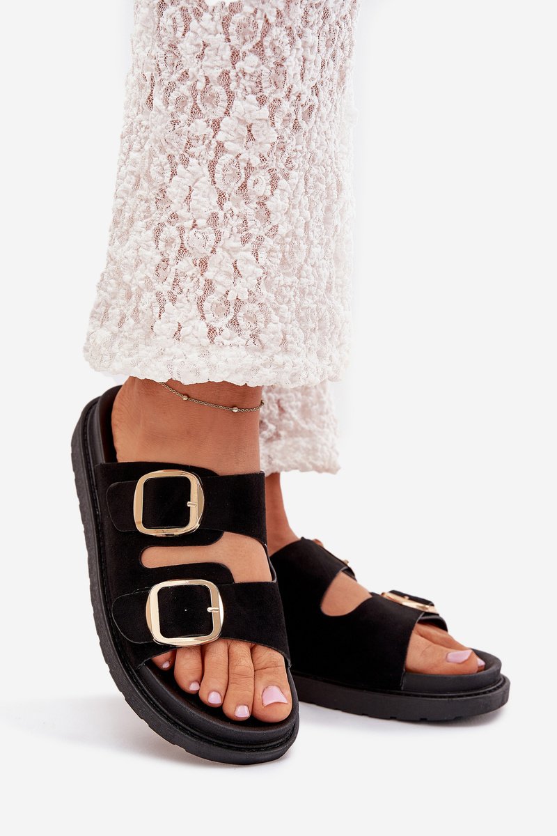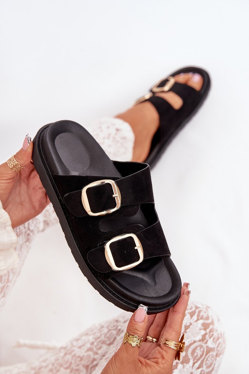 Sieviešu čības, izgatavotas no videi draudzīga zamšāda. Platforma. Divas regulējamas siksnas ar zelta sprādzēm nodrošina perfektu piegulumu, bet formēta zole garantē komfortu visas dienas garumā. Ideāli piemēroti ikdienas valkāšanai. Izvēloties izmēru, lūdzu, skatieties izmēru tabulu.