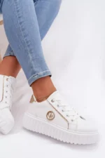 Sieviešu ekoloģiskās ādas sporta kurpes ir ideāls komforta un mūsdienīga stila apvienojums. Platforma izsmalcināti uzsver siluetu un nodrošina stabilitāti ejot. Dekoratīvā detaļa sānos piešķir tām oriģinālu raksturu un atšķir tās no klasiskajiem modeļiem. Mīksta putu zole, kas papildus pārklāta ar audumu, garantē komfortu visas dienas garumā. Šie sporta apavi ir ideāli piemēroti ikdienas pilsētas stilam. Izvēloties izmēru, skatieties izmēru tabulu.