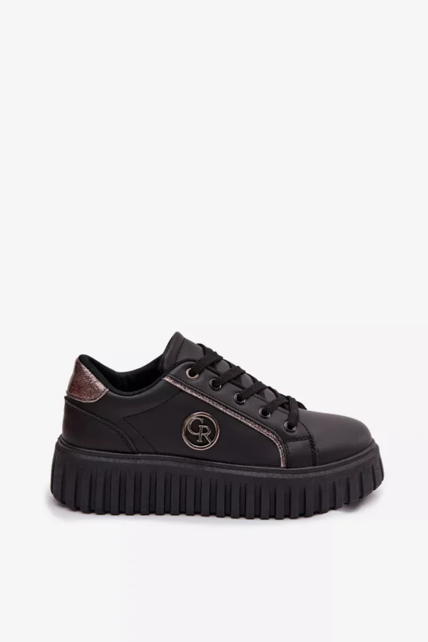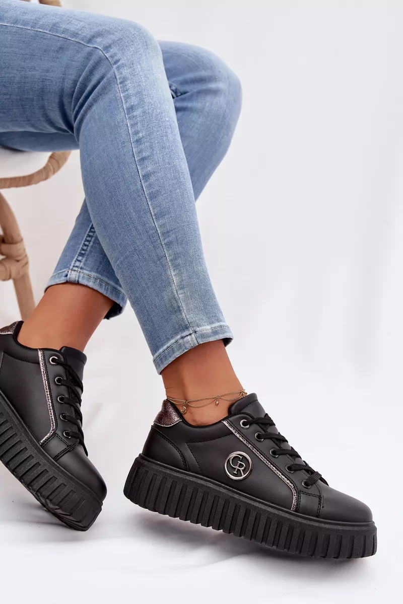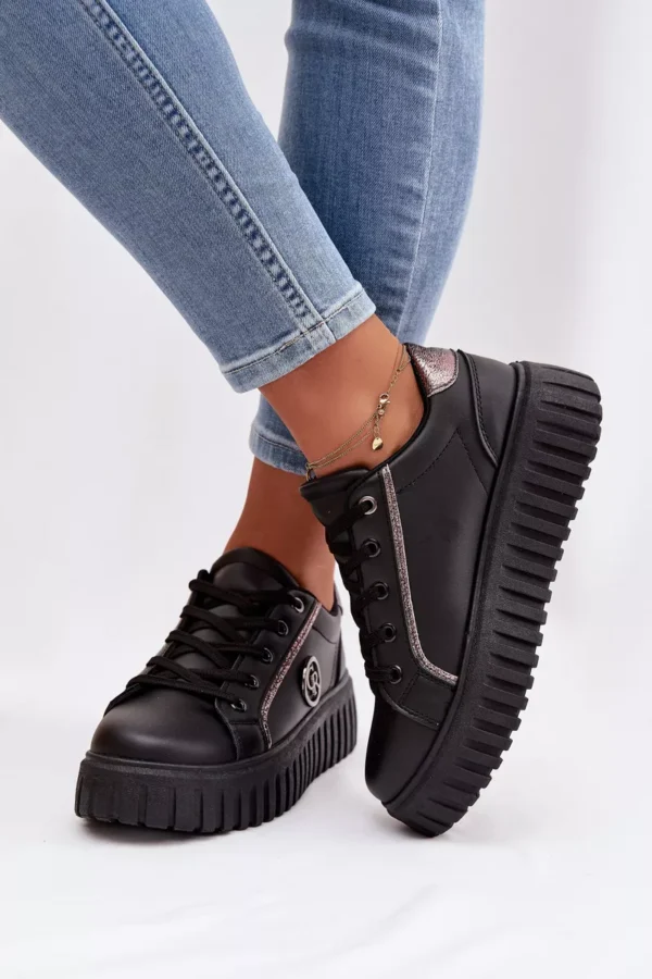 Sieviešu ekoloģiskās ādas sporta kurpes ir ideāls komforta un mūsdienīga stila apvienojums. Platforma izsmalcināti uzsver siluetu un nodrošina stabilitāti ejot. Dekoratīvā detaļa sānos piešķir tām oriģinālu raksturu un atšķir tās no klasiskajiem modeļiem. Mīksta putu zole, kas papildus pārklāta ar audumu, garantē komfortu visas dienas garumā. Šie sporta apavi ir ideāli piemēroti ikdienas pilsētas stilam. Izvēloties izmēru, skatieties izmēru tabulu.