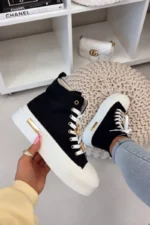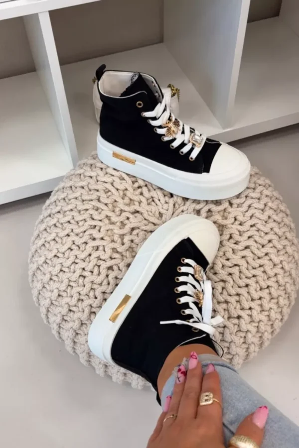 Sieviešu sporta apavi ar biezu platformu ir moderns izvēles variants tiem, kas mīl izteiksmīgu stilu. Bieza zole piešķir apaviem modernu raksturu un nodrošina komfortu, bet zelta elements ir acīm tverams detaļas. Aizšņorējams dizains nodrošina labu piegulumu, bet dekoratīvās sprādzes piešķir oriģinalitāti un modernu izskatu. Šie apavi ir ideāli piemēroti ikdienas stilam. Izvēloties izmēru, skatieties izmēru tabulu.
