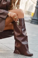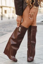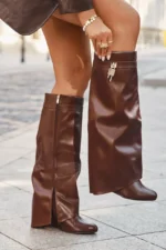 Šie sieviešu potītes zābaki, kas izgatavoti no videi draudzīgas zamšādas, ir ideāls komforta un elegances apvienojums. Tie ir aprīkoti ar platformas zoli. Modelis tiek aizdarīts ar ērtu rāvējslēdzēju, un apgrieztais apakšmalas apmales elements piešķir tam izteiksmīgu raksturu. To visu papildina lenta augšdaļā ar dekoratīvu detaļu, kas piešķir smalku dekoratīvu akcentu. Šie stilīgie zābaki ir ideāli piemēroti gan ikdienas, gan elegantiem apģērbiem. Izvēloties izmēru, lūdzu, skatieties izmēru tabulu. Izvēloties izmēru, lūdzu, skatieties izmēru tabulu.
