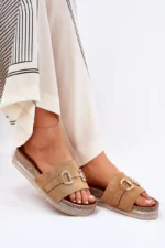 Šie čības ir izgatavotas no videi draudzīga zamšāda. Tām ir dekoratīvs zelta akcents priekšpusē, kas piešķir tām smalku mirdzumu. Tās ir uz platformas, kas dekorēta ar gliteriem, piešķirot glamour pieskārienu jebkuram stilam. Konturēta zole nodrošina komfortu visas dienas garumā. Šie čības ir ideāli piemērotas vasaras dienām un labi saderas ar kleitām, svārkiem vai biksēm, apvienojot modernu izskatu ar funkcionalitāti. Izvēloties izmēru, lūdzu, izmantojiet izmēru tabulu.