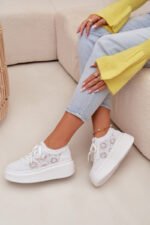 Stilīgi sieviešu sporta apavi ar šņorku augšdaļu ir oriģināla izvēle siltajam laikam. Angoras tekstūra piešķir tiem vieglumu un pavasarīgu raksturu, bet platforma subtili pacilā siluetu, nodrošinot stabilitāti. Mīkstā zole garantē komfortu visas dienas garumā. Šis modelis ir ideāls ikdienas stilam, piešķirot tam modernu un unikālu akcentu. Izvēloties izmēru, lūdzu, izmantojiet izmēru tabulu.