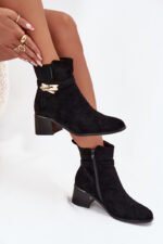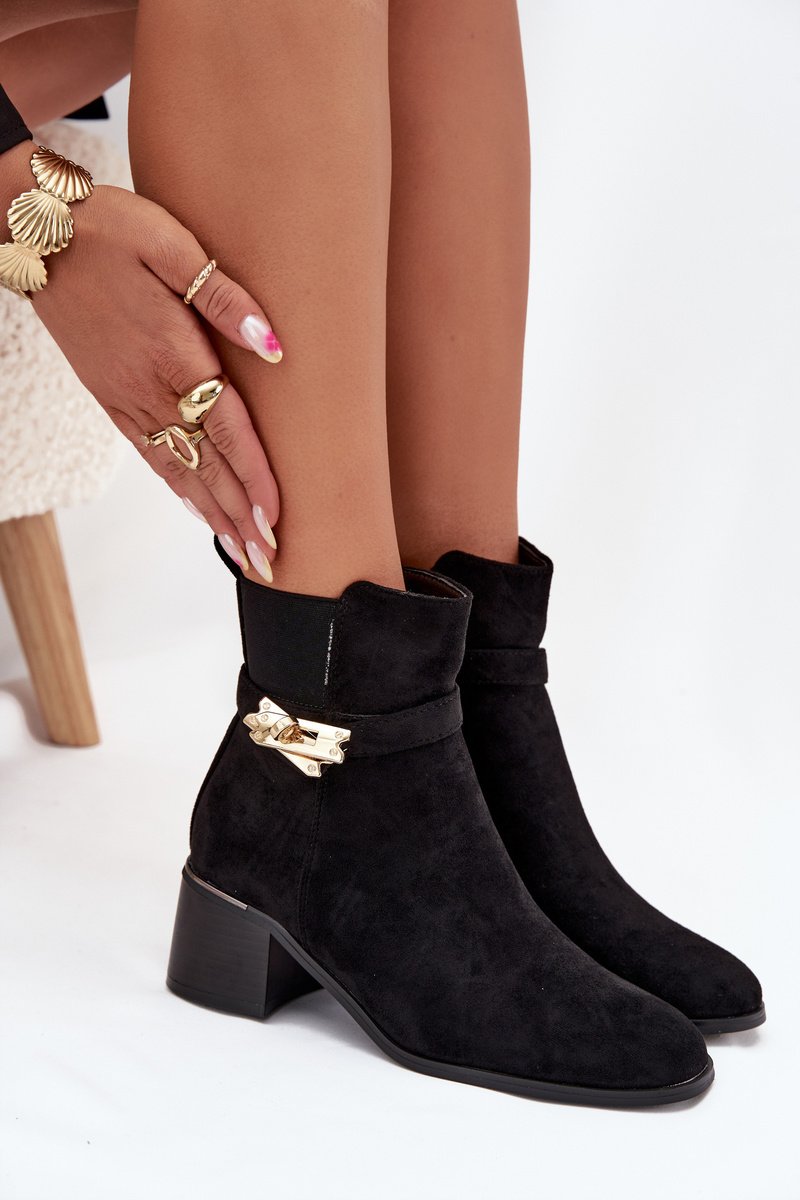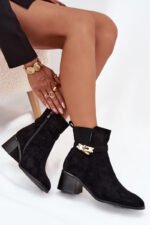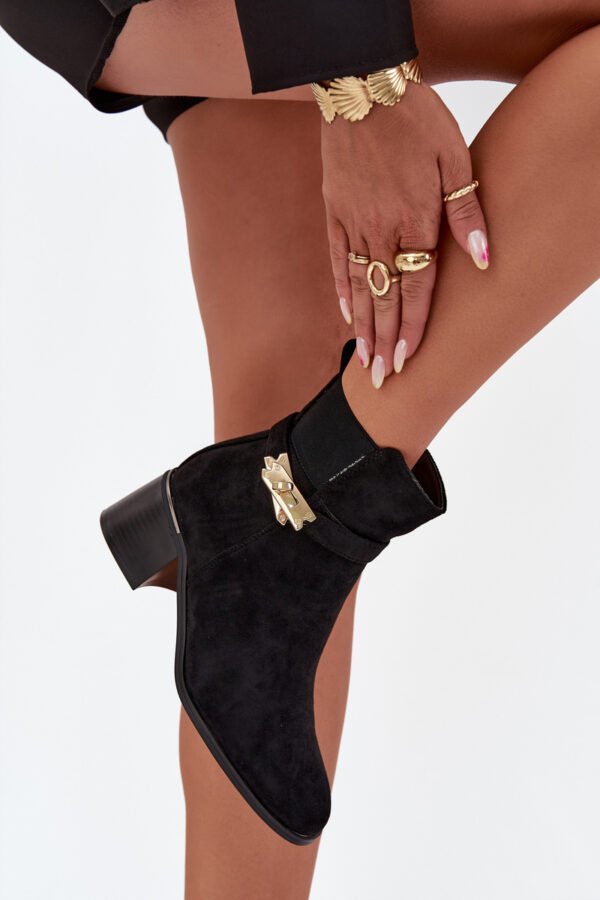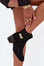Sieviešu potītes zābaki no videi draudzīga zamšāda ir lieliska izvēle vēsākām dienām. Ar blokveida papēdi tie nodrošina stabilitāti un komfortu visas dienas garumā. Fleece oderējums garantē siltumu un komfortu. Pirksti ir noapaļoti. Augšējā daļa, kas rotāta ar zelta krāsas ornamentu, piešķir unikālu akcentu, padarot tos par perfektu papildinājumu elegantiem ziemas tērpiem. Izvēloties izmēru, lūdzu, izmantojiet izmēru tabulu. Izvēloties izmēru,