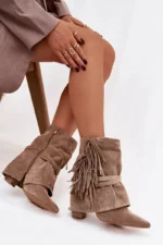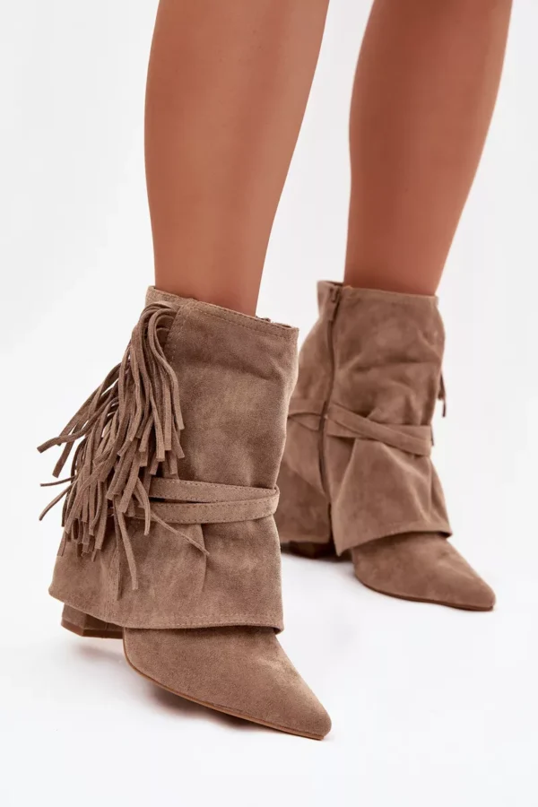 Sieviešu ekoloģiskie zamšādas potītes zābaki – perfekta stila un oriģinālu detaļu kombinācija, kas piesaista uzmanību. Augšējā daļa, kas pārklāta ar papēdi, izsmalcina siluetu, bet smaili purngali piešķir eleganci un sievišķību. Modelis ir dekorēts ar kniedēm un plānām siksnām ar zelta sprādzēm, kas piešķir tam modernu akcentu un izsmalcinātu, mūsdienīgu izskatu. Zābaki ir ideāli piemēroti gan ikdienas, gan svinīgiem apģērbiem, piešķirot tiem unikālu un stilīgu izskatu. Ērtas un iespaidīgas, tās ir lieliska izvēle gan ikdienas valkāšanai, gan īpašiem gadījumiem. Izvēloties izmēru, lūdzu, izmantojiet izmēru tabulu. Izvēloties izmēru, lūdzu, izmantojiet izmēru tabulu.