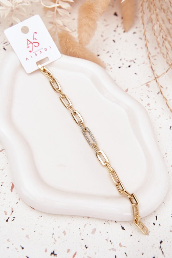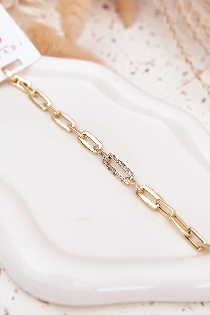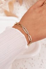 Šī sieviešu ķēdes rokassprādze, kas izgatavota no ķirurģiskā tērauda, ir stilīgs aksesuārs ar elegantu raksturu. Trīs dekoratīvi elementi ar maziem cirkonija akmentiņiem piešķir tai smalku mirdzumu un piesaista uzmanību. Izturīga, moderna un sievišķīga — ideāli piemērota gan ikdienas, gan svinīgam izskatam.