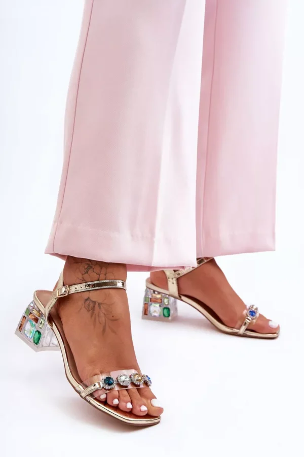 Skaistas sieviešu sandales, izgatavotas no videi draudzīgas ādas un plastmasas. Tās ir ar zemu, dekorētu blokveida papēdi. Apavu priekšpuse ir rotāta ar dekoratīviem akmentiņiem. Kurpes tiek piestiprinātas ap potīti ar regulējamu siksnu ar sprādzi. Mīksta zole no dabiskas ādas nodrošinās jūsu komfortu lietošanas laikā. Izvēloties izmēru, lūdzu, skatieties izmēru tabulu.