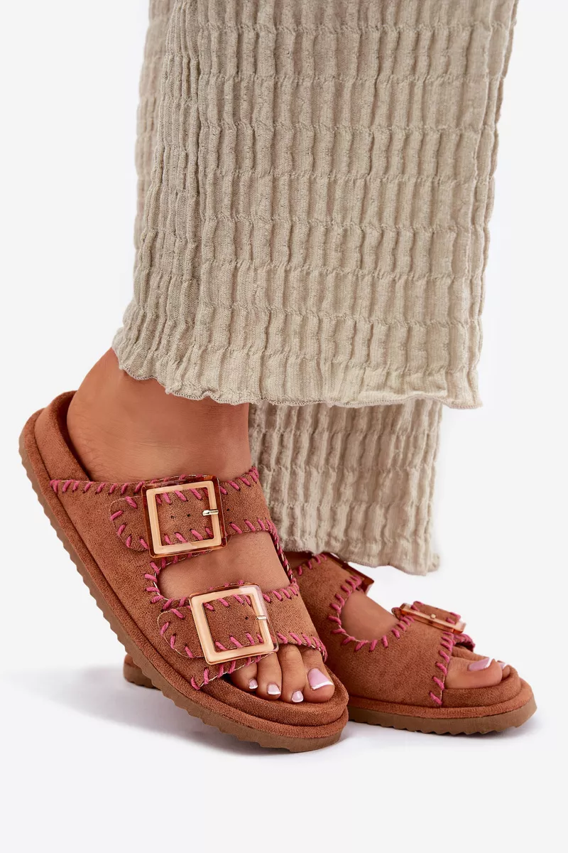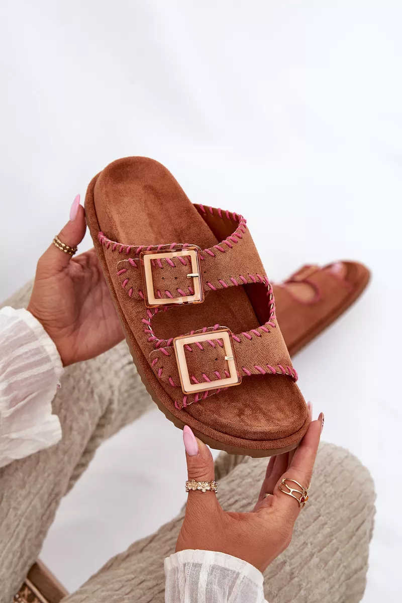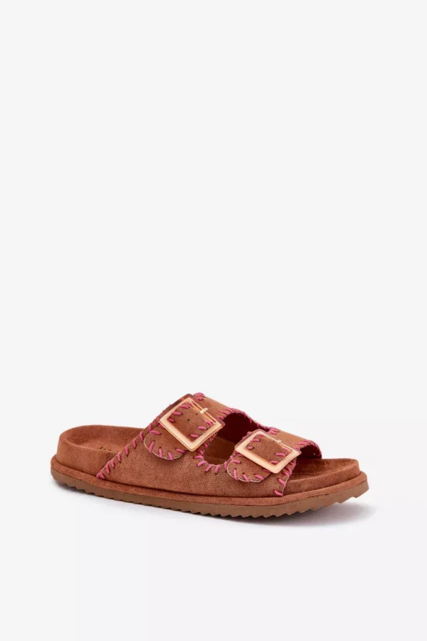 Sieviešu čības no videi draudzīga zamšāda ar pievilcīgu dekoratīvo apdari un iespaidīgām sprādzēm priekšā. Komfortu nodrošina formēta zole, kas perfekti pielāgojas pēdas formai. Šis moderns modelis ir lieliska izvēle vasaras dienām – ideāls gan pilsētas stilam, gan brīvdienu ceļojumiem! Izvēloties izmēru, skatieties izmēru tabulu.