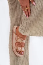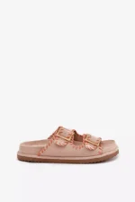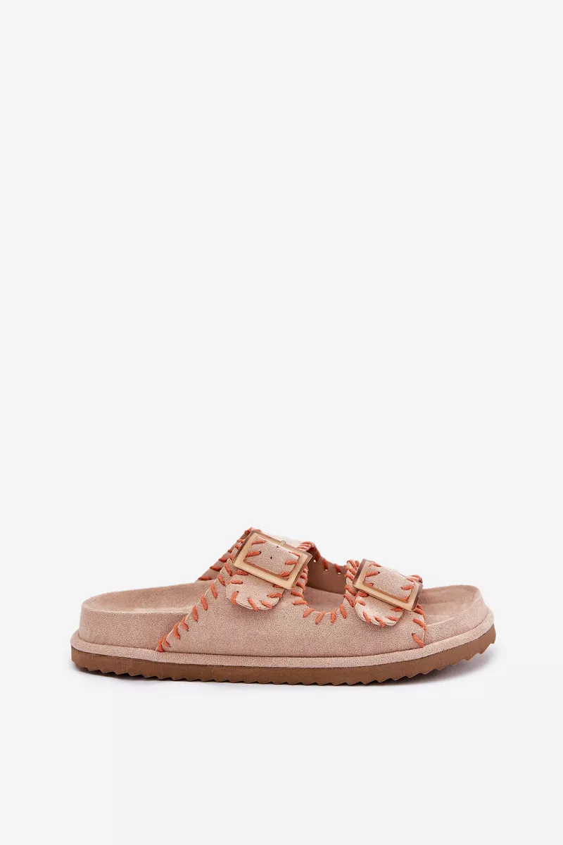 Sieviešu čības no videi draudzīga zamšāda ar pievilcīgu dekoratīvo apdari un iespaidīgām sprādzēm priekšā. Komfortu nodrošina formēta zole, kas perfekti pielāgojas pēdas formai. Šis moderns modelis ir lieliska izvēle vasaras dienām – ideāls gan pilsētas stilam, gan brīvdienu ceļojumiem! Izvēloties izmēru, skatieties izmēru tabulu.