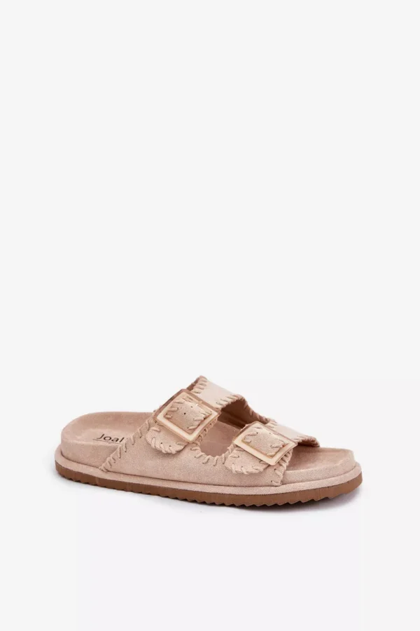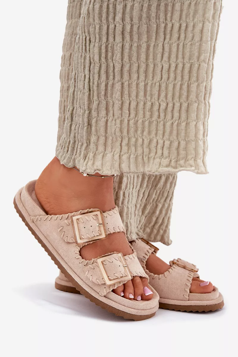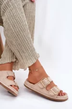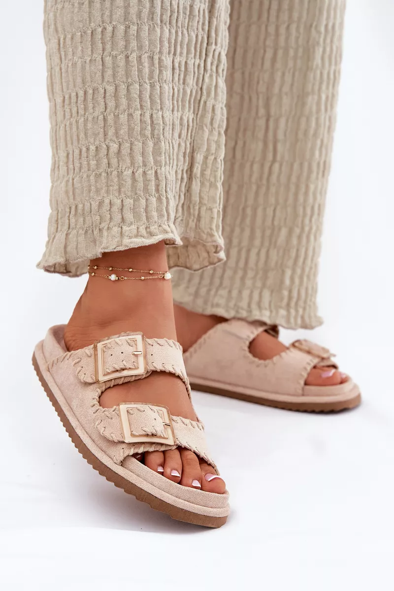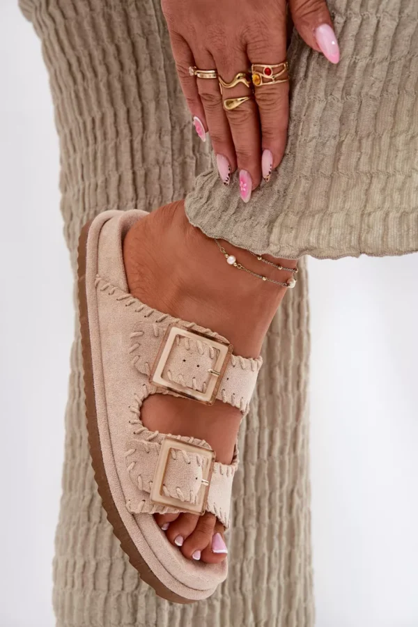 Sieviešu čības no videi draudzīga zamšāda ar pievilcīgu dekoratīvo apdari un iespaidīgām sprādzēm priekšā. Komfortu nodrošina formēta zole, kas perfekti pielāgojas pēdas formai. Šis moderns modelis ir lieliska izvēle vasaras dienām – ideāls gan pilsētas stilam, gan brīvdienu ceļojumiem! Izvēloties izmēru, skatieties izmēru tabulu.