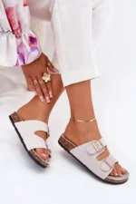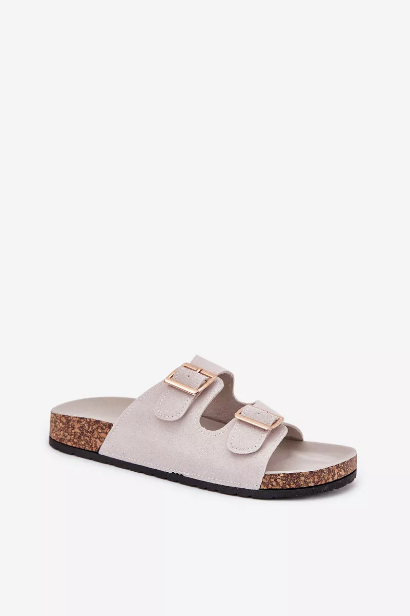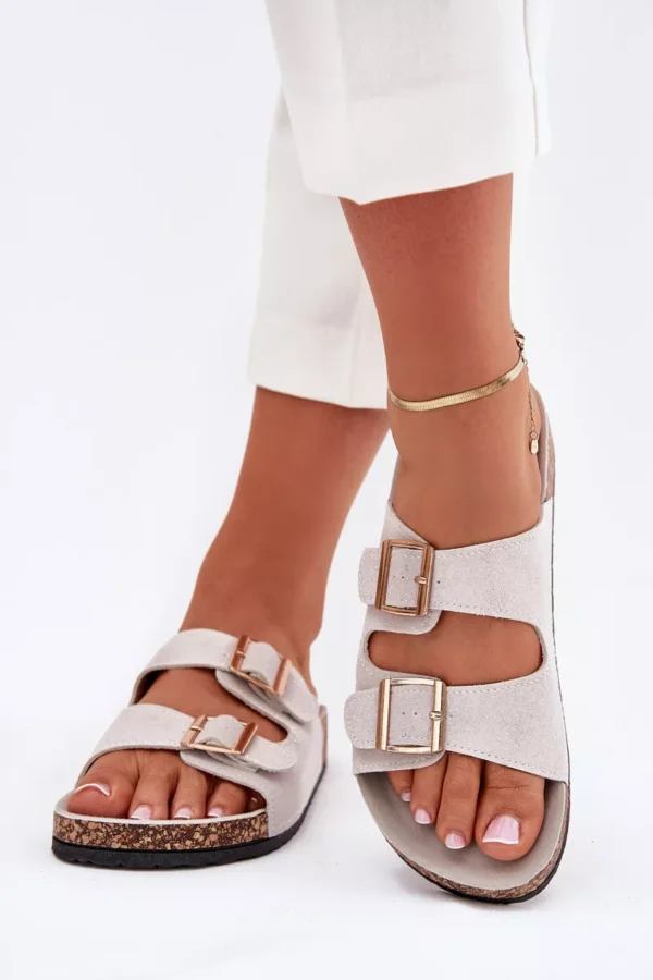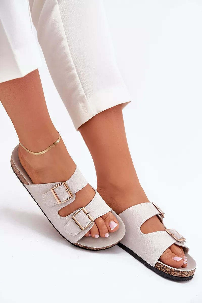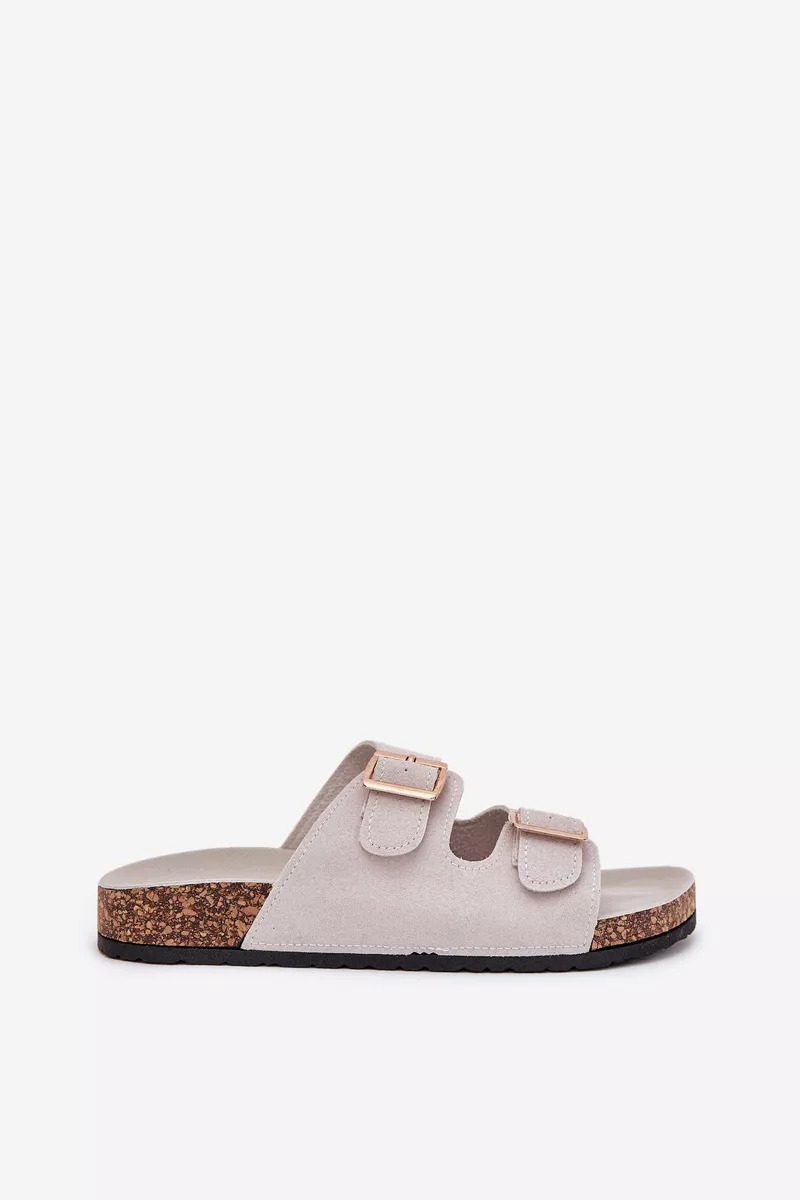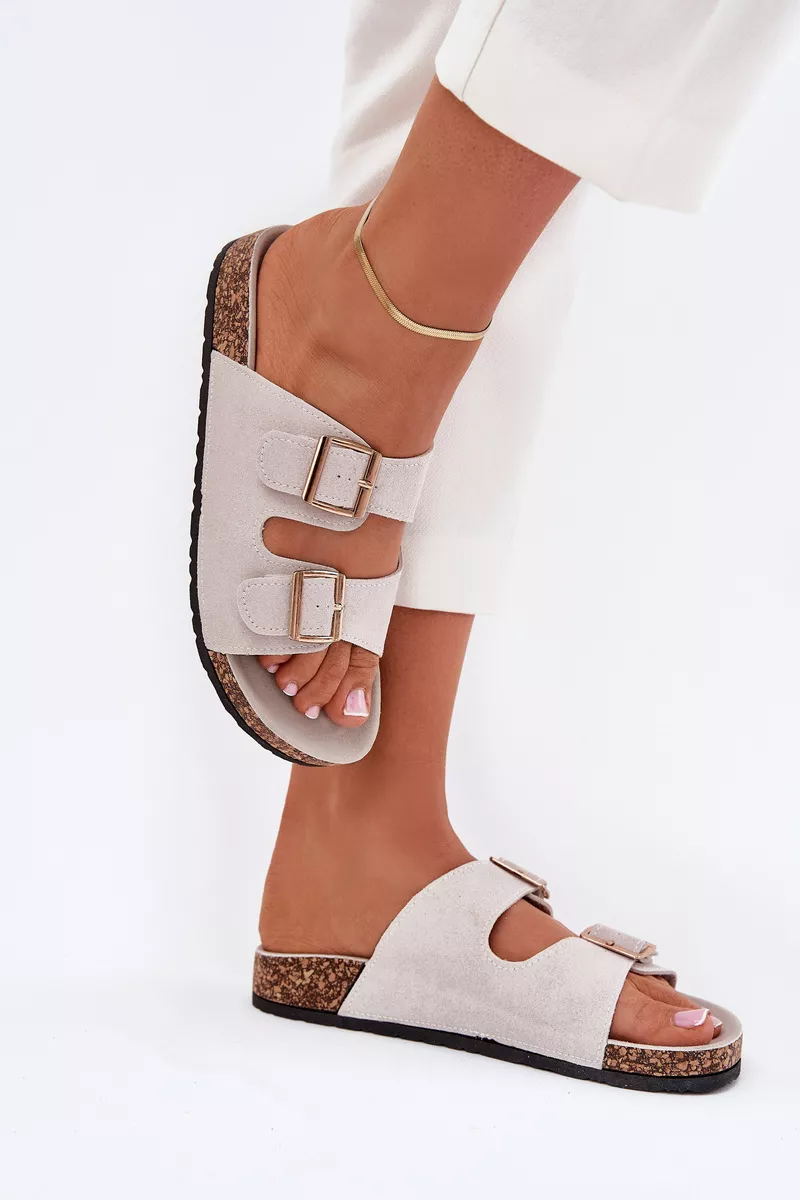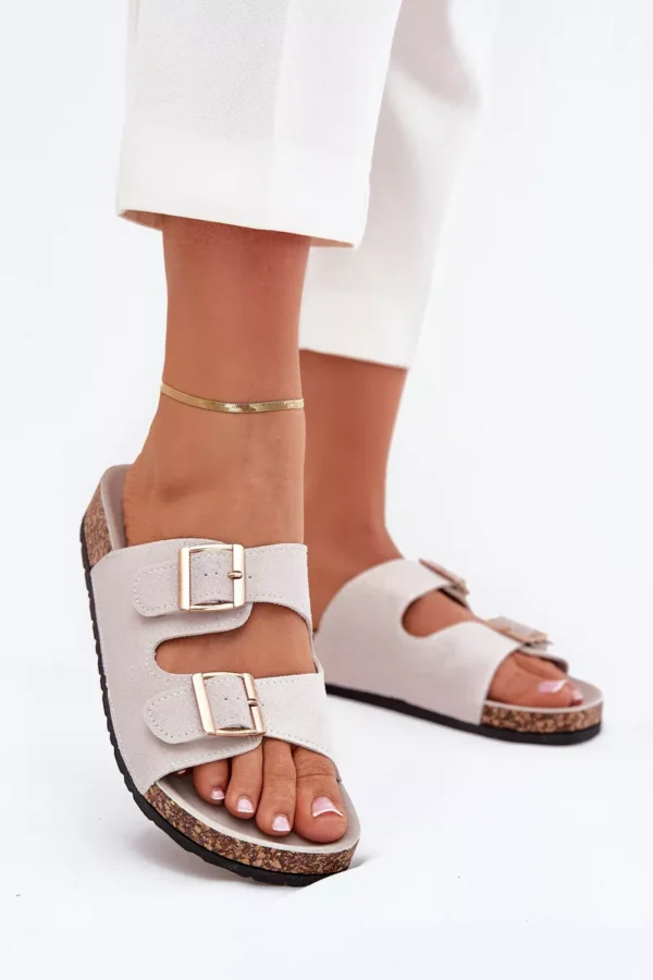 Šie sieviešu ekoloģiskās zamšādas čības ar korķa platformu apvieno stilu un komfortu. Divas zelta sprādzes ar regulējamiem siksniņām nodrošina perfektu pielāgošanos, bet konturēta zole garantē komfortu visas dienas garumā. Ideāli piemēroti vasaras stila apģērbiem, tie labi sader ar kleitām, svārkiem vai šortiem. Izvēloties izmēru, skatieties izmēru tabulu.
