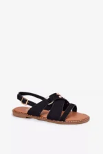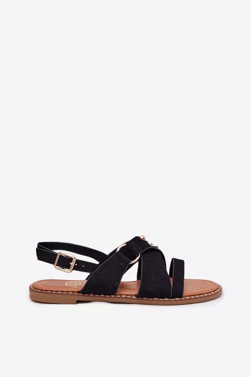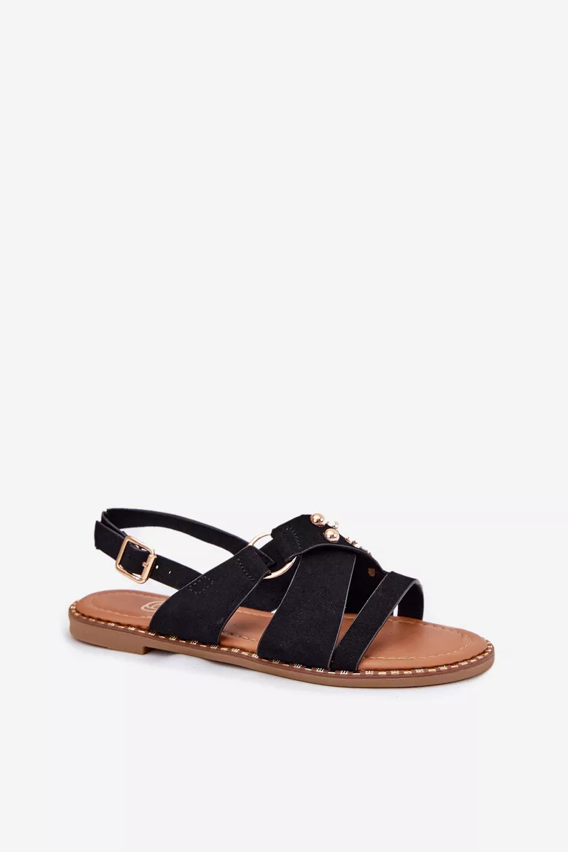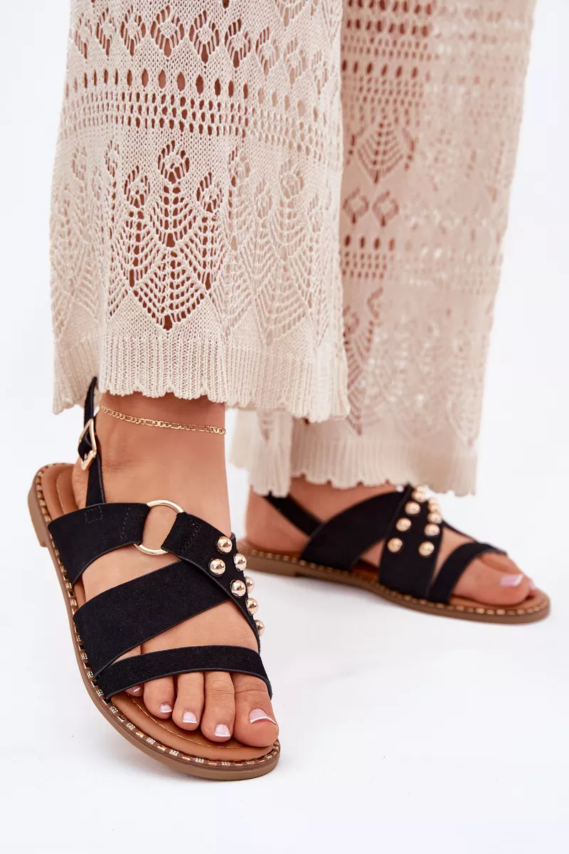 Sieviešu sandales uz plakaniem papēžiem ar zelta kniedēm, melnas Zanira