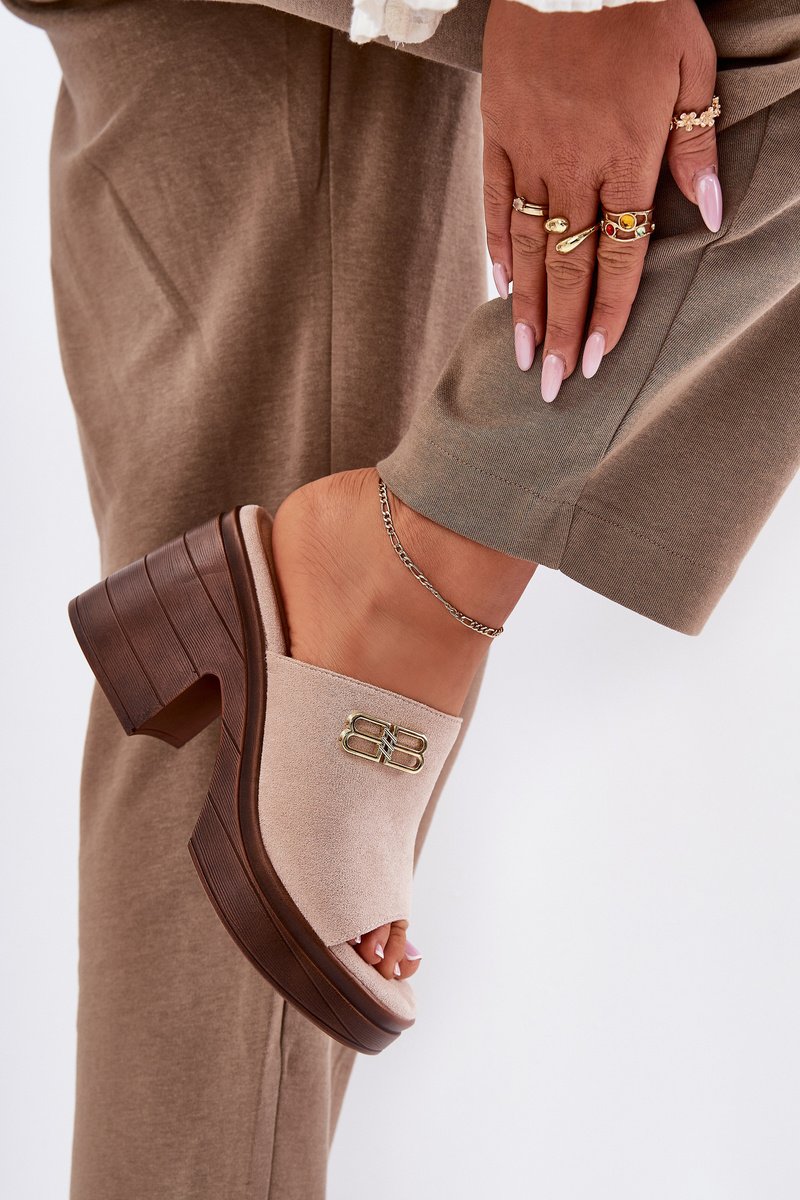 Šie elegantie sieviešu čības, kas izgatavotas no ekoloģiskā zamšāda, ir ideāla izvēle īpašiem gadījumiem. Zelta detaļas priekšpusē piešķir tām elegantu raksturu. Čības ir ar biezu papēdi un platformu, kas nodrošina stabilitāti un komfortu visas dienas garumā. Šie čības apvieno modernu dizainu ar funkcionalitāti, perfekti saderot ar elegantiem stiliem dažādiem svinīgiem pasākumiem un vakara izklaidēm. Izvēloties savu izmēru, lūdzu, izmantojiet izmēru tabulu.