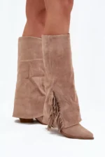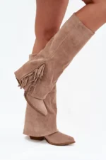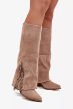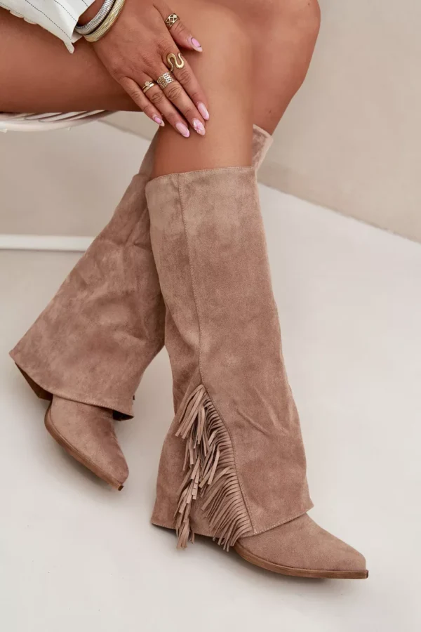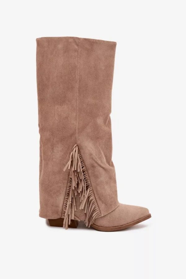 Šie uzvelkamie kovboju zābaki no ekoloģiskā zamšāda ar blokveida papēžiem apvieno komfortu un stilu. Smaileveida purngali piešķir eleganci, bet dekoratīvās fringes uz augšdaļas piešķir vieglu boho pieskārienu. Tie ir ideāli piemēroti ikdienas stilam, labi sader ar kleitām, svārkiem un biksēm, piešķirot jebkuram apģērbam kovboju šarmu. Izvēloties savu izmēru, lūdzu, izmantojiet izmēru tabulu.