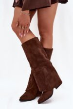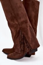 Šie uzvelkamie kovboju zābaki no ekoloģiskā zamšāda ar blokveida papēžiem apvieno komfortu un stilu. Smaileveida purngali piešķir eleganci, bet dekoratīvās fringes uz augšdaļas piešķir vieglu boho pieskārienu. Tie ir ideāli piemēroti ikdienas stilam, labi sader ar kleitām, svārkiem un biksēm, piešķirot jebkuram apģērbam kovboju šarmu. Izvēloties savu izmēru, lūdzu, izmantojiet izmēru tabulu.