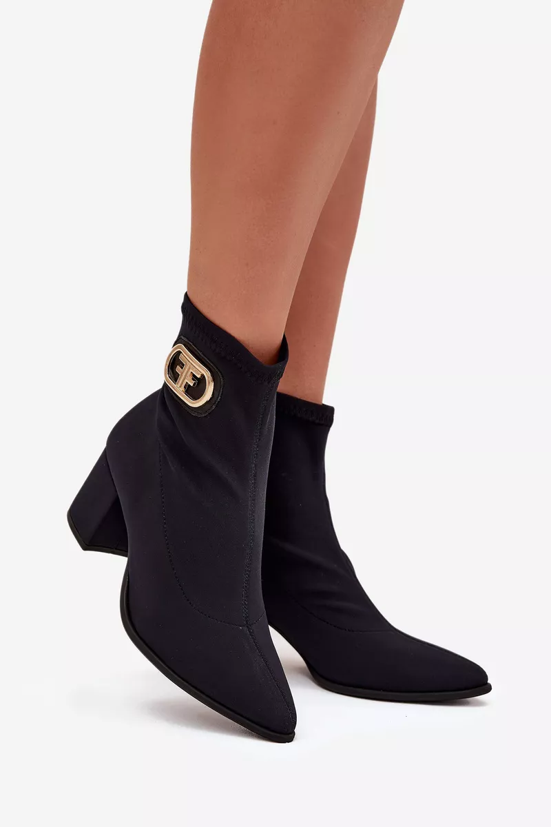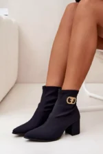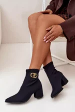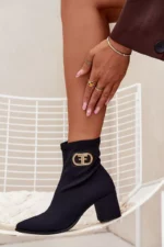 Eleganti sieviešu potītes zābaki no tekstilmateriāla ar blokveida papēdi. Smaile formas purngals vizuāli pagarina kājas, bet dekoratīvais zelta akcents sānos piešķir tiem unikālu raksturu. Slip-on dizains nodrošina vieglu valkāšanu, un tie perfekti sader ar elegantiem kleitām, svārkiem vai biksēm, radot elegantu izskatu dažādām dzīves situācijām. Izvēloties savu izmēru, lūdzu, izmantojiet izmēru tabulu.