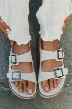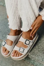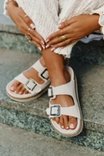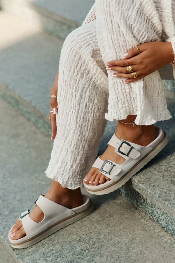 D.Franklin Nordic Sandal Buckle Full Black čības apvieno stilu un komfortu praktiskā un funkcionālā dizainā. Tās ir izgatavotas no zamšādas siksnām, kas nodrošina mīkstu un izturīgu apdari, kas ir ideāli piemērota ikdienas lietošanai. Regulējama sprādzes aizdare nodrošina individuālu pielāgojumu, garantējot stabilitāti un komfortu katrā solī. EVA zole ar izciļņiem nodrošina vieglumu un izcilu saķeri, padarot tos ideālus jebkuram reljefam. D.Franklin logotips uz mēles un papēža piešķir izteiksmīgu un modernu akcentu. Lūdzu, izvēloties savu izmēru, skatieties izmēru tabulu.