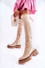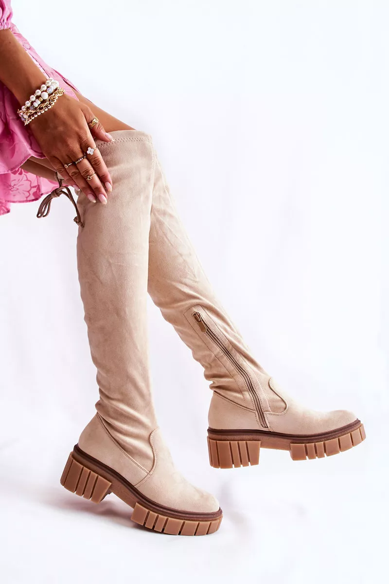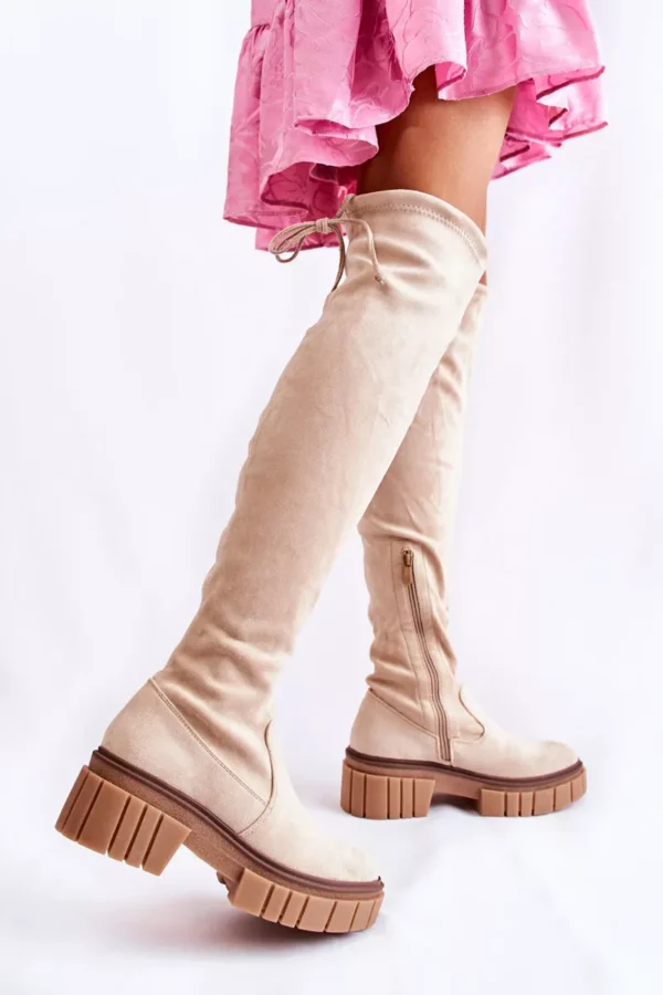 Skaisti sieviešu zābaki ar augšdaļu virs ceļgala. Modelis ir izgatavots no videi draudzīga zamšāda, kas ir patīkams uz tausti. Aizdarās ar rāvējslēdzēju augšdaļas sānos. Turklāt zābaki ir ar auklām, kas ļauj tos pareizi pielāgot. Modelis ir uzstādīts uz stabila plakanā papēža un platformas. Zābaki ir izolēti tikai pēdas augstumā ar pēdas gultni. Pastiprināts papēdis. Izvēloties izmēru, izmantojiet izmēru tabulu.
